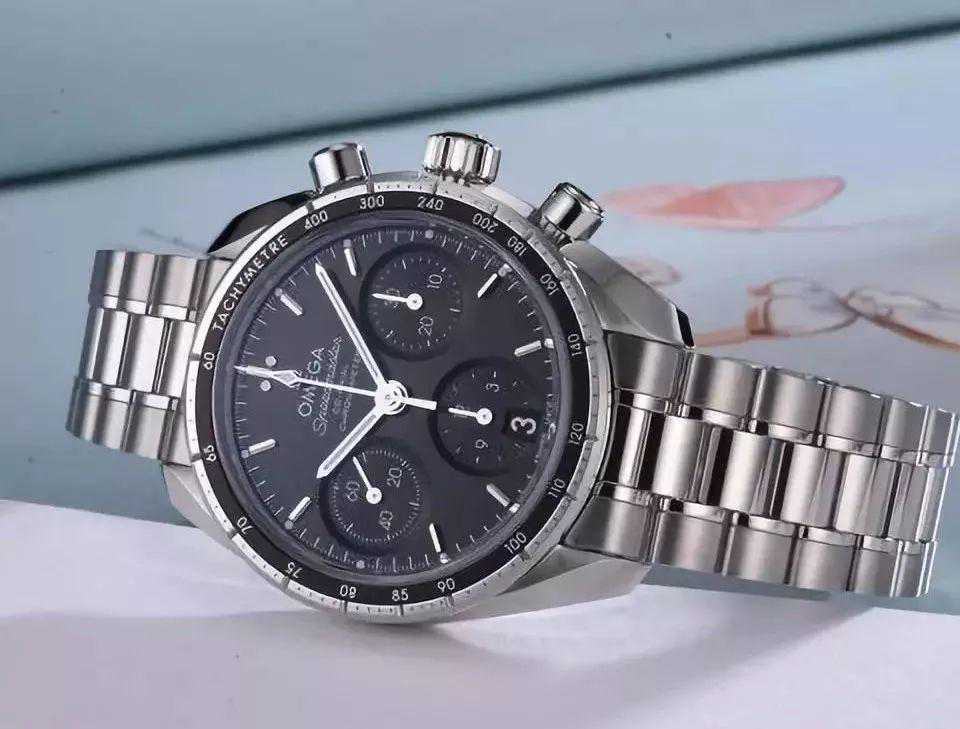 欧米茄也是时下广受欢迎的腕表品牌之一,这款38mm的超霸系列腕表,采用太阳射线黑色表盘和中央镀铑计时指针,九点钟位置设有小秒盘,六点钟位置为12小时计时盘和日历窗口,三点钟位置为30分钟计时盘,功能极为强大。