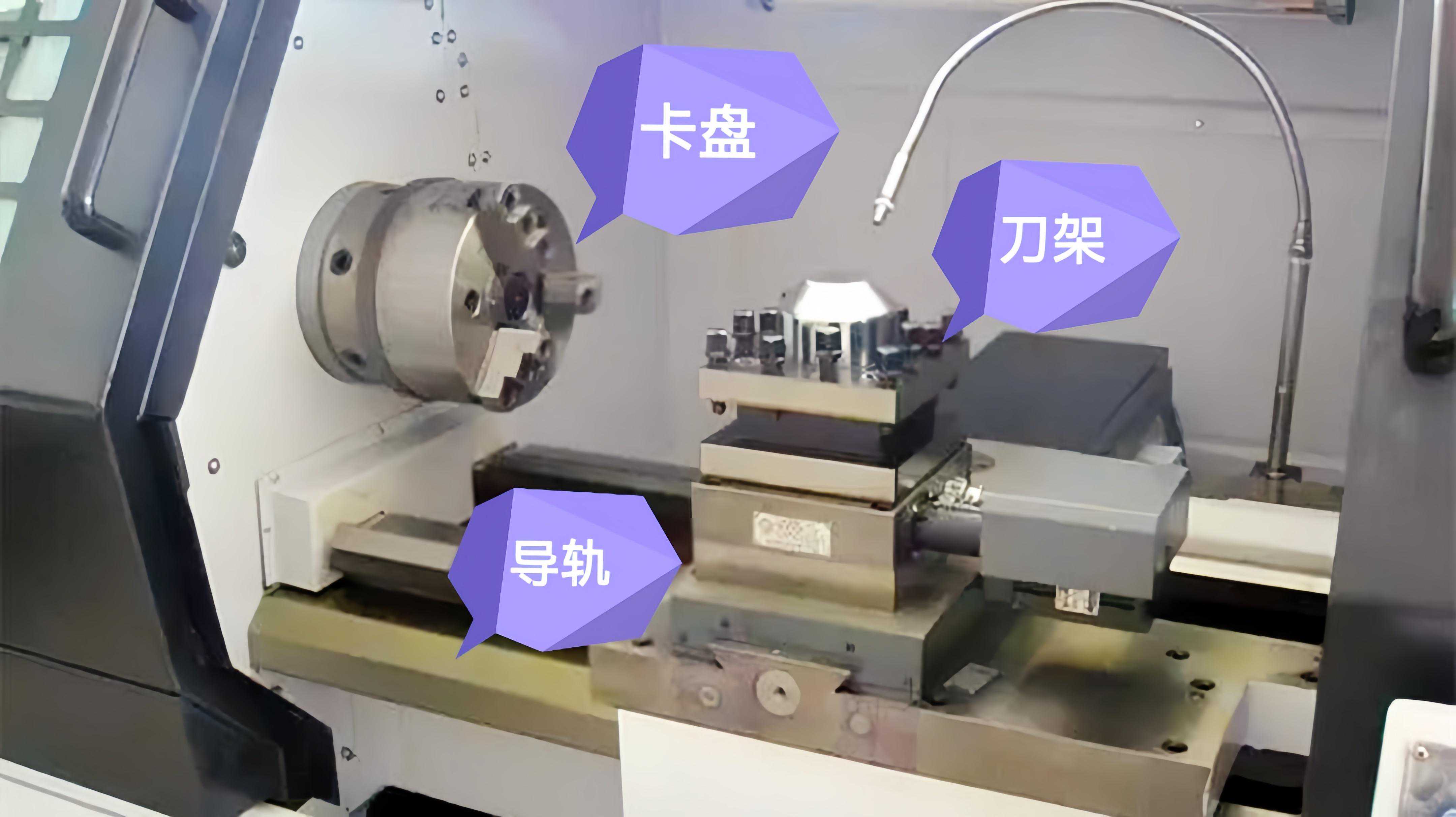 各部分的作用:车床主体主要起到一个稳定的作用,因为它本身体积较重而且有阻尼装置。驱动电机主要通过主轴带动卡盘的高速旋转,你想一想毛坯物料不高速旋转,如何来进行切削呢?伺服电机比如它可以驱动刀架的自动旋转、换刀等等。卡盘是通过液压系统卡住物料,并且在高速旋转的时稳定性强。车床一般都有两条导轨,一个是横向的一个是纵向的,横向的通常是快速移动到目标点,然后通过纵向的导轨来调整刀具的位置,然后进行合适的切割。刀架前面也说了,加工物料需要不同的刀具,这个刀架主要是安装刀具的地方,并且这个刀架可以根据编辑的程序,在伺服电机的驱使下自动的切换刀具。