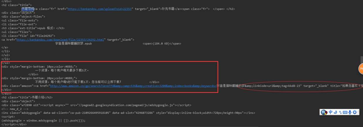 红色矩形部分则为电子书的下载链接,这是在请求中使用的Cookie才出现的
