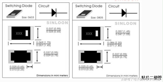 其实吧,要是想简单的话,直接拿个尺子量一量,直接在protel上画封装就行了,不过我没有尺子,手头上的直尺还是借对门的,件太小,不好动手量,我认真的劲又犯了,就是想找到这种贴片二极管的标准封装名称及相关数据手册,然后根据标准来画自己的封装库,可以先查了一下花了一个小时时间,确定与贴片二极管有关的封装信息如下,前面几个我可以确定,后边的详细资料我没查: