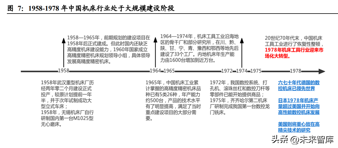 我国现代机床工业的基础源于国民经济恢复期和“一五”时期(1953-1957)。在1949年以前,我国并没有真正的机床工业,只在上海等地有少数工厂能够制造简易的皮带机床。1952年中央召开的全国第一次工具机会议才为我国机床工具行业的发展定下基调,而同年美国已经制造出了世界上第一台数控机床。此后在苏联帮助下,我国在三年国民经济恢复时期和“一五”期间,通过对部分机械厂的改扩建和新建,初步建立起我国的机床行业。其中确定的18家骨干企业被称为“十八罗汉厂”,这十八家国有机床厂在此后我国机床行业的发展中长期占据着主导地位。1958年,我国制造出第一台数控机床,仅比世界第一台数控机床晚6年。但需要注意的是,由于我国产业基础较差,从实验室样机到工业大规模应用仍有极大距离。