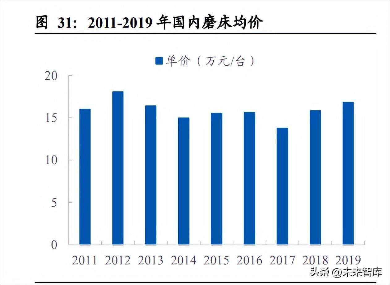 国产磨床均价整体稳定,进口磨床均价缓慢提升。2011-2019年国产磨床单台均价整体稳定,大约为15-16万元左右。进口磨床单台均价超100万元,且呈缓慢提升趋势,表明随着我国制造业转型升级,我国对进口磨床的需求也在向更高端发展。