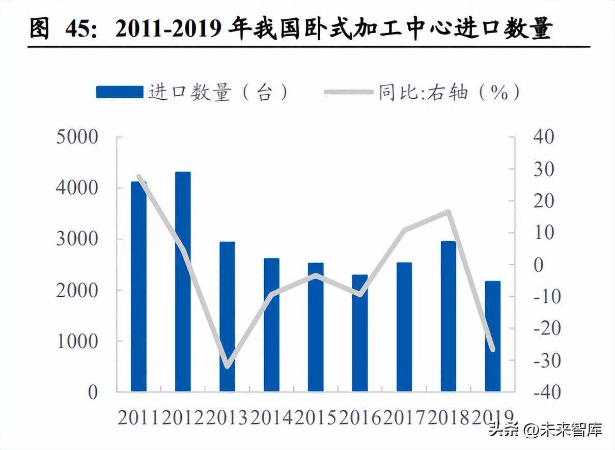 卧式加工中心进口规模持续下降,国产替代稳步推进。2011-2019年,我国卧式加工中心进口数量、金额整体下降,尤其是近年进口规模下降幅度大于国内,说明在机床市场需求总量下降背景下,我国卧式加工中心国产替代也在稳步推进。