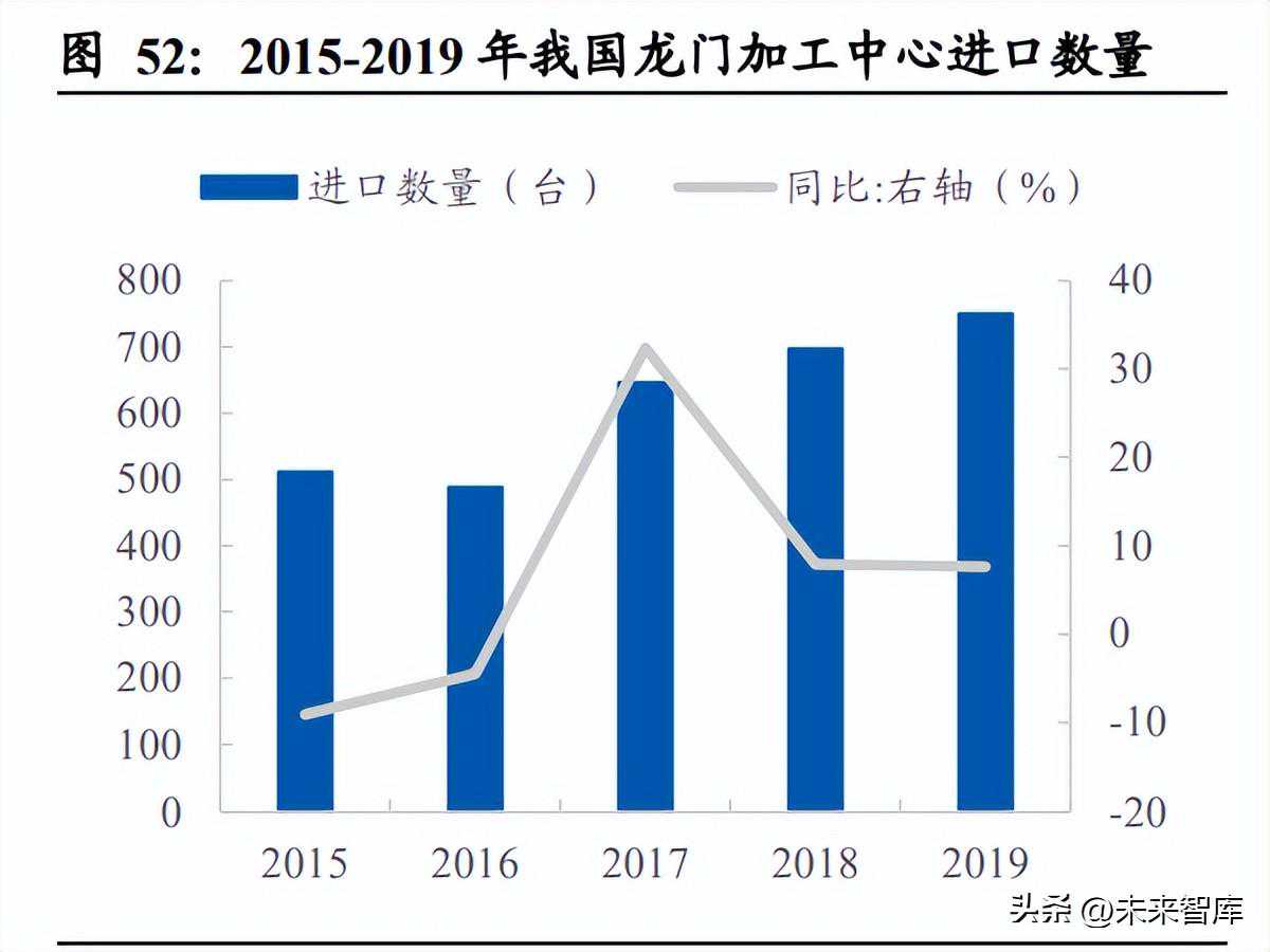 整体来看,2019年国内龙门加工中心市场规模接近40亿,部分国产龙门加工中心产品技术相对成熟,已具备一定市场竞争力,但定制化、高精高速等高端龙门加工中心主要进口欧洲、日本等地区的局面还未改善。