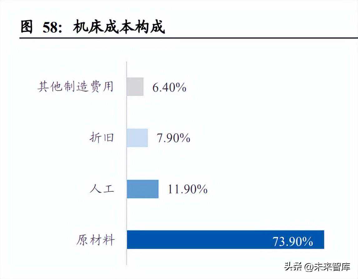从成本结构来看:在机床生产过程中,原材料成本占比最高,为73.9%,其次是人工、折旧与其他制造费用,分别占比11.9%、7.9%和6.4%。而在原材料成本的进一步拆分中,由铸件加工而成的底座床身等结构件占比最大,通常在30%-40%左右,价格受钢材影响较大;其次是数控系统占比22%;由丝杠导轨等传动机械以及辅助动力系统等组成的传动系统占比20%;高速主轴和电机等组成的驱动系统占比13%;刀库、刀塔等占比5%;光栅尺占比2%。通常具备规模优势的企业,在进行原材料采购时能够享受到和采购规模对应的折扣优惠,能有效增加公司毛利率。