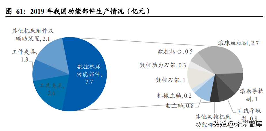 工业基础薄弱产业链短板突出,中高端机床关键配套件发展滞后仍然依赖进口。功能部件产业发展的滞后已成为数控机床发展中公认的瓶颈,目前国产可替代的核心部件已经逐渐发展成熟,部分主机厂已逐步使用国产核心部件进行境外品牌替代。但由于技术水平仍存在一定差距,若全部采用国产核心部件,对于主机厂而言,其高端数控机床的精度水平、精度的稳定性、精度的保持性都会受到影响,进而影响高端数控机床的销售情况,因此目前我国的中高端机床关键配套部件主要依赖进口。2019年我国功能部件产值13.7亿元,从细分结构上看,产值占比最高的是数控机床功能部件生产产值7.7亿元,其中滚珠丝杠副产值2.7亿元、滚动导轨副和直线导轨副产值1.8亿元、电主轴和机械主轴产值1亿元。而进口方面,2019年我国功能部件进口总额达15.3亿美元,其中,机床零部件进口额9.0亿美元(折合人民币62.41亿元),进口规模是国产配套零部件产值的8.1倍。