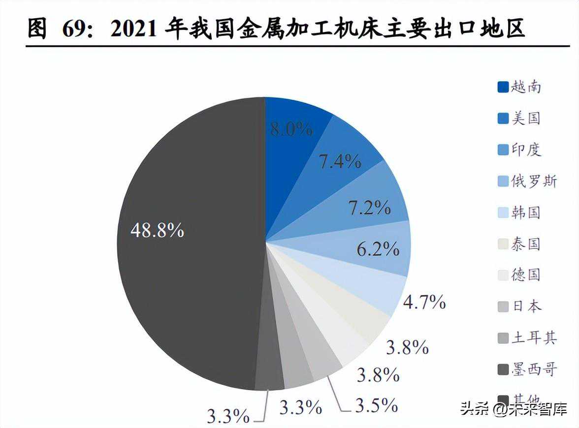 国产机床在发展中国家性价比优势突出,国产机床出海潜力巨大。2021年我国金属切削机床出口36.5亿美元,同比增长32.7%。虽然目前国产机床畅销日本、欧美等机床产业发达的地区难度相对较大,但在部分发展中国家和地区性价比优势明显。近年国产机床在越南、印度、土耳其、墨西哥等地的销售增长迅速(以中低端机床为主,出口均价仅为0.03万美元左右),随着国内机床企业纷纷加大海外渠道布局力度,国产机床出海潜力巨大。