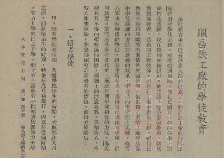 《人事管理》1937年第2卷第5期第41-46页刊载的《顺昌铁工厂的学徒教育》