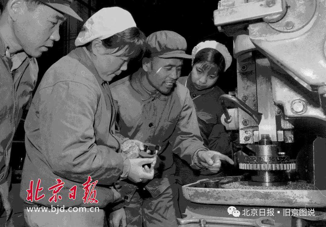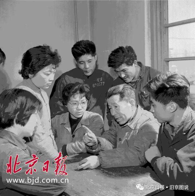 1956年,北京第一机床厂加工车间齿轮工段工人杨学孔正同青年工人一起研究怎样进一步提高产品质量。李祖慧摄