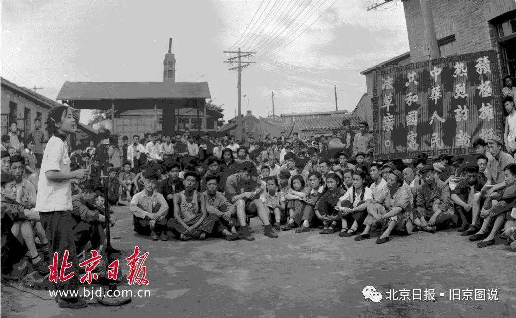 1954年,北京第一机床厂全体职工认真进行学习和讨论宪法草案。冯文冈摄