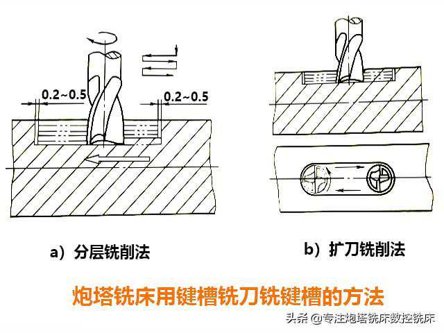 炮塔铣床用键槽铣刀铣键槽时,有分层铣削法和扩刀铣削法两种。