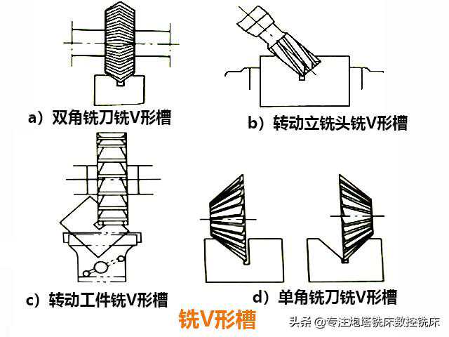 2、炮塔铣床铣V形槽。通常先选用锯片铣刀加工出底部的窄槽,然后可以用双角铣刀、立铣刀、三面刃铣刀或单脚铣刀完成V形槽的加工。