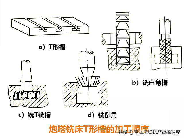 3、炮塔铣床铣T形槽。先用立铣刀或三面刃铣刀铣出直角槽,然后再用T形槽铣刀铣T形槽,此时铣削用量应选得小一些,而且要注意充分冷却,最后用角度铣刀铣倒角。