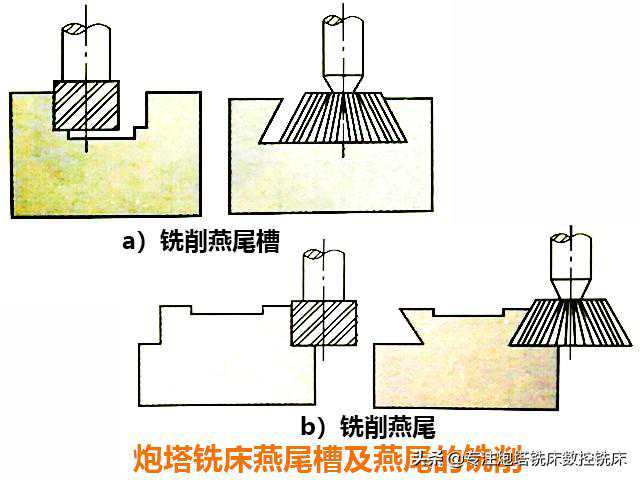 ①先铣出直槽或台阶,再用燕尾槽铣刀铣削燕尾槽或燕尾。