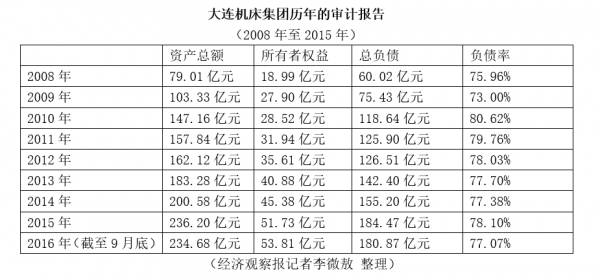 根据大连机床集团的历年财务报告和审计报告,至少从2008年开始,其负债率一直在70%-80%之间,有的年份一度还超过了80%。