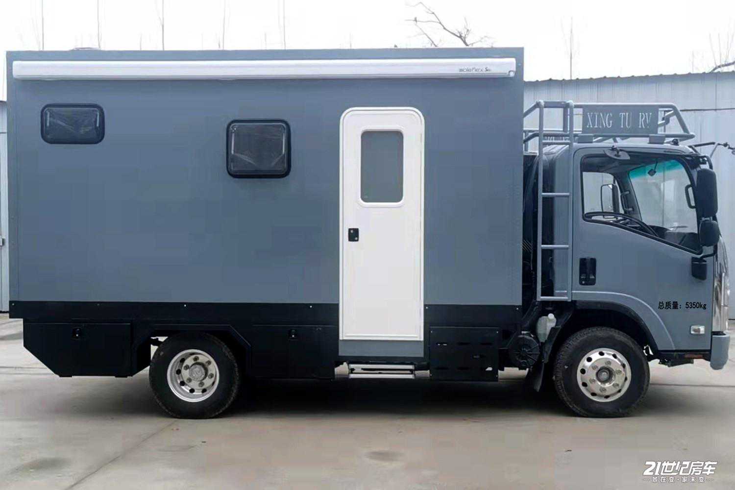 这款房车是由庆铃五十铃KV800轻卡底盘改装而来,相比五十铃700P底盘,KV800在售价、发动机排量以及承载能力方面都要弱一些,因此它的市场定位也略低。这款房车由江苏鸿昌特种车辆有限公司申报,外形采用方箱造型,加之平头卡车车头短的优势,箱体内的生活空间普遍比依维柯等房车宽敞一些。这款车的外观尺寸为5995×2380×3150(mm),最大总质量5350kg,整备质量为4500kg。底盘方面,五十铃KV800选用的是一条三吨级前桥和五吨级后桥,承载能力整体不错,在满载的时候会有不错的表现。