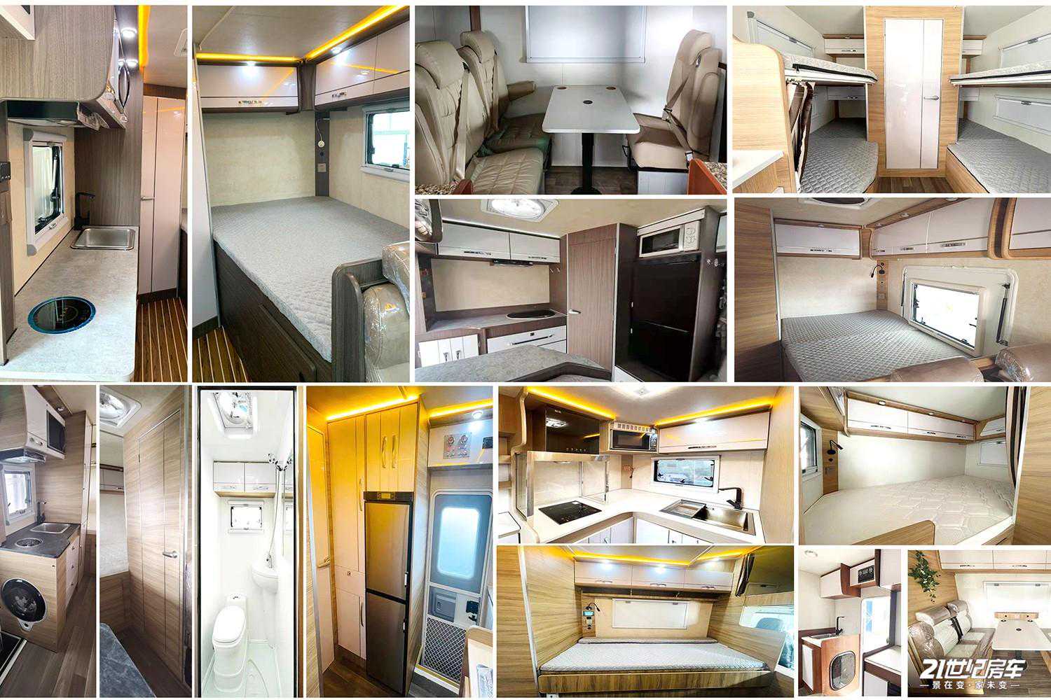车内有多款布局类型可选,其中涵盖了后总纵床布局、后L型厨房布局、后上门客厅大沙发床布局以及适用于租赁出行的6座6卧版布局车型,基本上属于一款底盘,可以嫁接若干款内饰布局,只看用户的实际需要去做选择。内饰配色偏沉稳,灯光系统为深色暖光氛围灯,根据申报图细节部分可以发现卫生间采用的是吸塑开模件覆盖,常见的房车配置也都有配备。