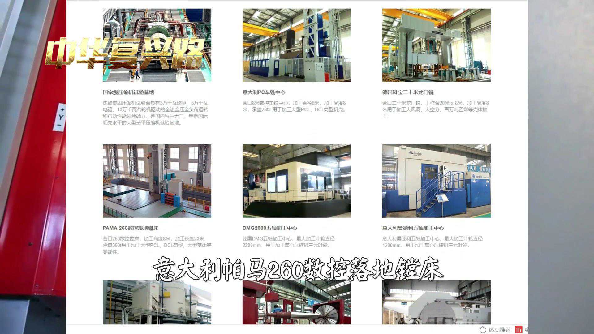 沈鼓集团是国内领先的通用装备制造基地,有意大利PC车铣中心,德国瓦德里西科堡的二十米龙门铣,意大利帕马PAMA260数控落地镗床,德玛吉2000五轴加工中心,意大利曼德利五轴加工中心,德国沃伦贝格数控车铣中心,德国申克DH6/DH70高速动平衡机。