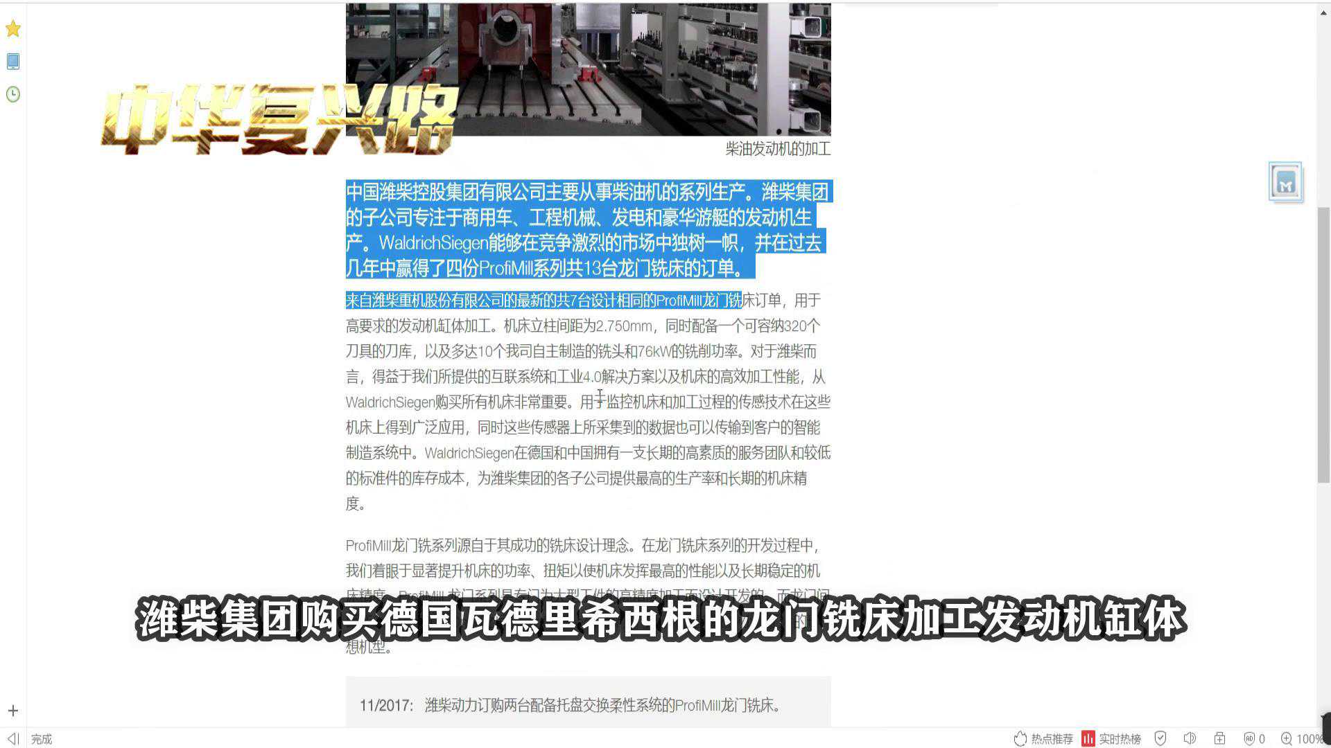 潍柴集团和东方电气集团购买德国瓦德里希·西根WaldrichSiegen的(ProfiMill)龙门铣床加工发动机缸体和发电设备。上海机床厂购买德国瓦德里希·西根WaldrichSiegen的龙门铣床ProfiMill制造机床床身。