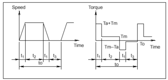 工作机械频繁启动,制动时所需转矩,当工作机械作频繁启动,制动时,必须检查电机是否过热,为此需计算在一个周期内电机转矩的均方根值,并且应使此均方根值小于电机的连续转矩。负载周期性变化的转矩计算,也需要计算出一个周期中的转矩均方根值,且该值小于额定转矩。这样电机才不会过热,正常工作。