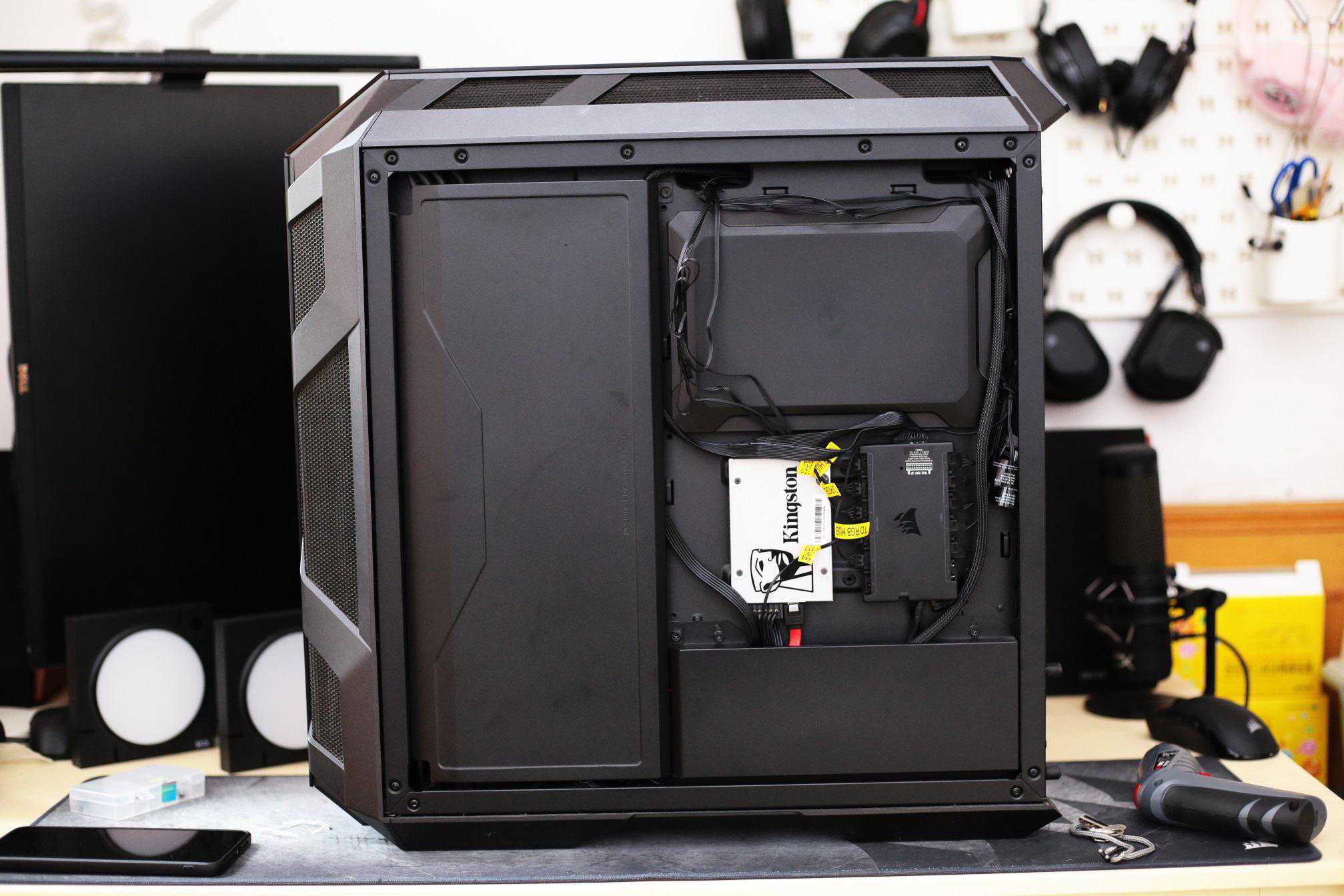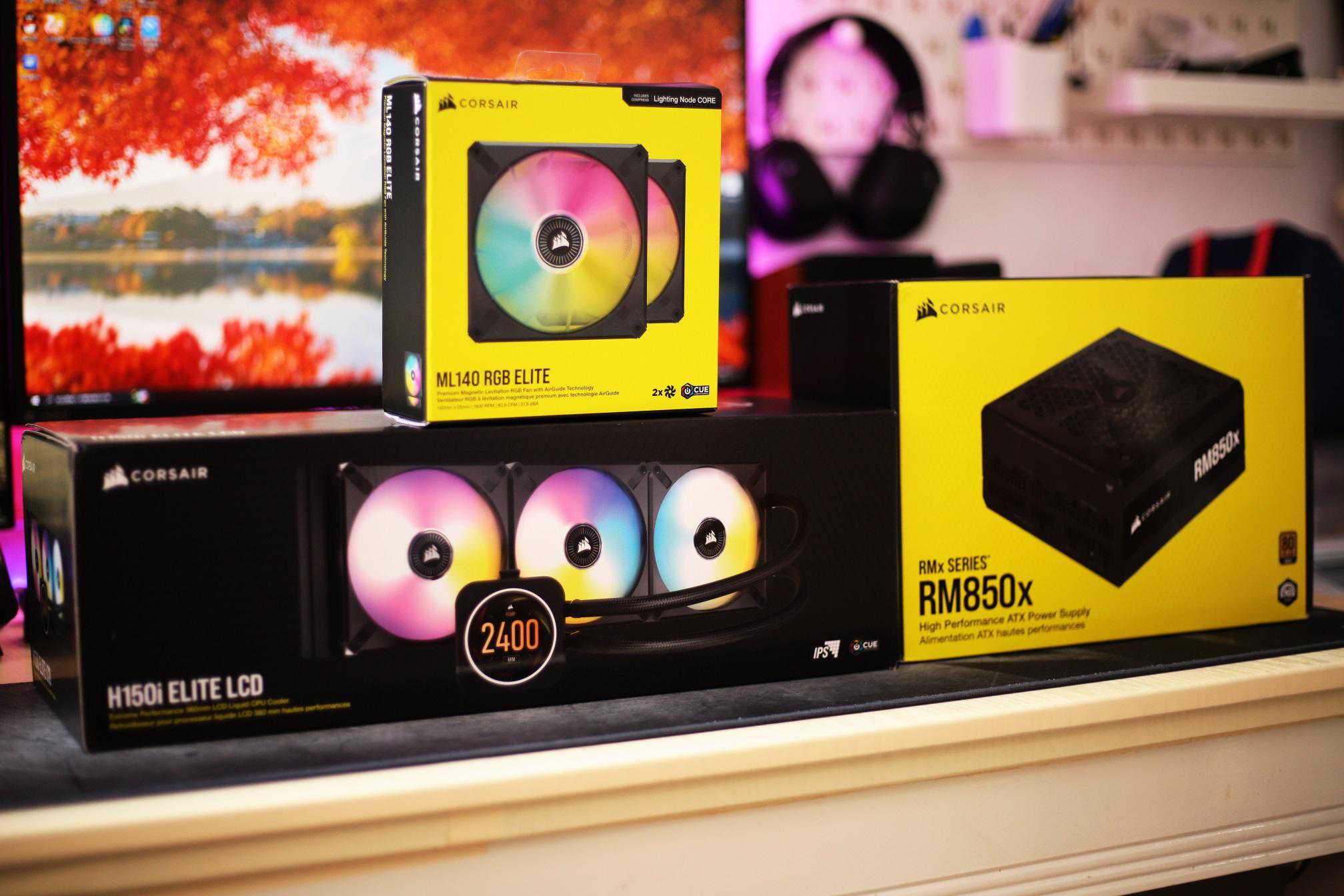 东西只有三个,却轻松将我的桌面占满,美商海盗船H150iEliteLCD液晶屏水冷散热器,美商海盗船RM850x全模组电源,美商海盗船ML140RGBELITE精英版两颗装。