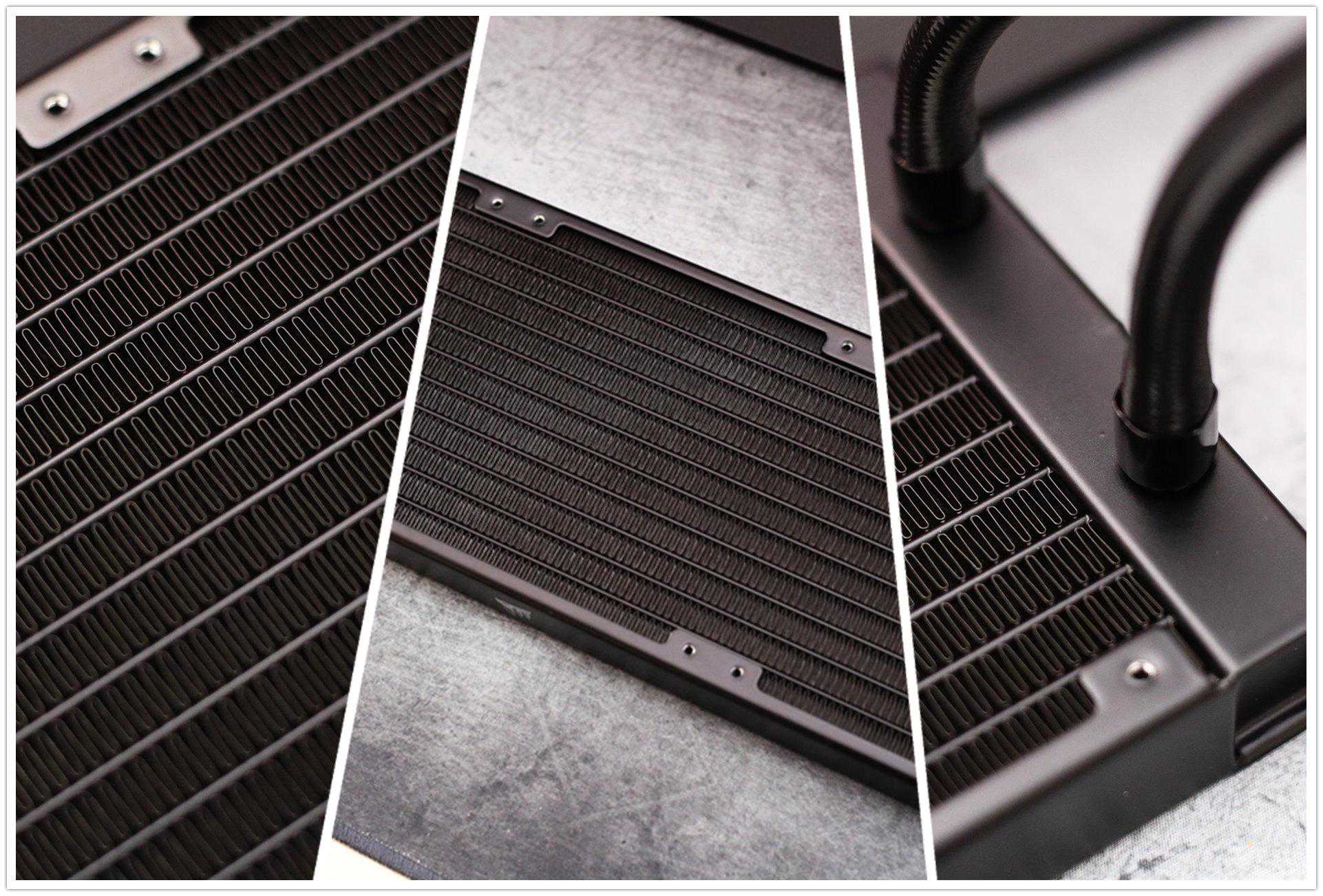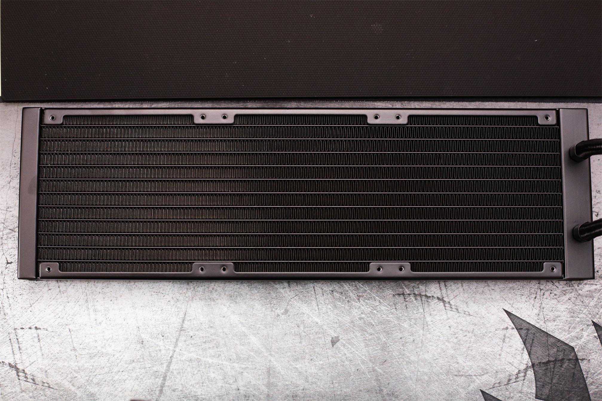 水冷排的体型尺寸相当夸张,赶得上一把机械键盘,和大多数散热器一样容过高密度鳍片带来较大的散热面积,再配合水冷液的流动与三颗风扇提高散热效能。毫不夸张的说可以压得住市面上所有CPU应对各种高负荷场景。