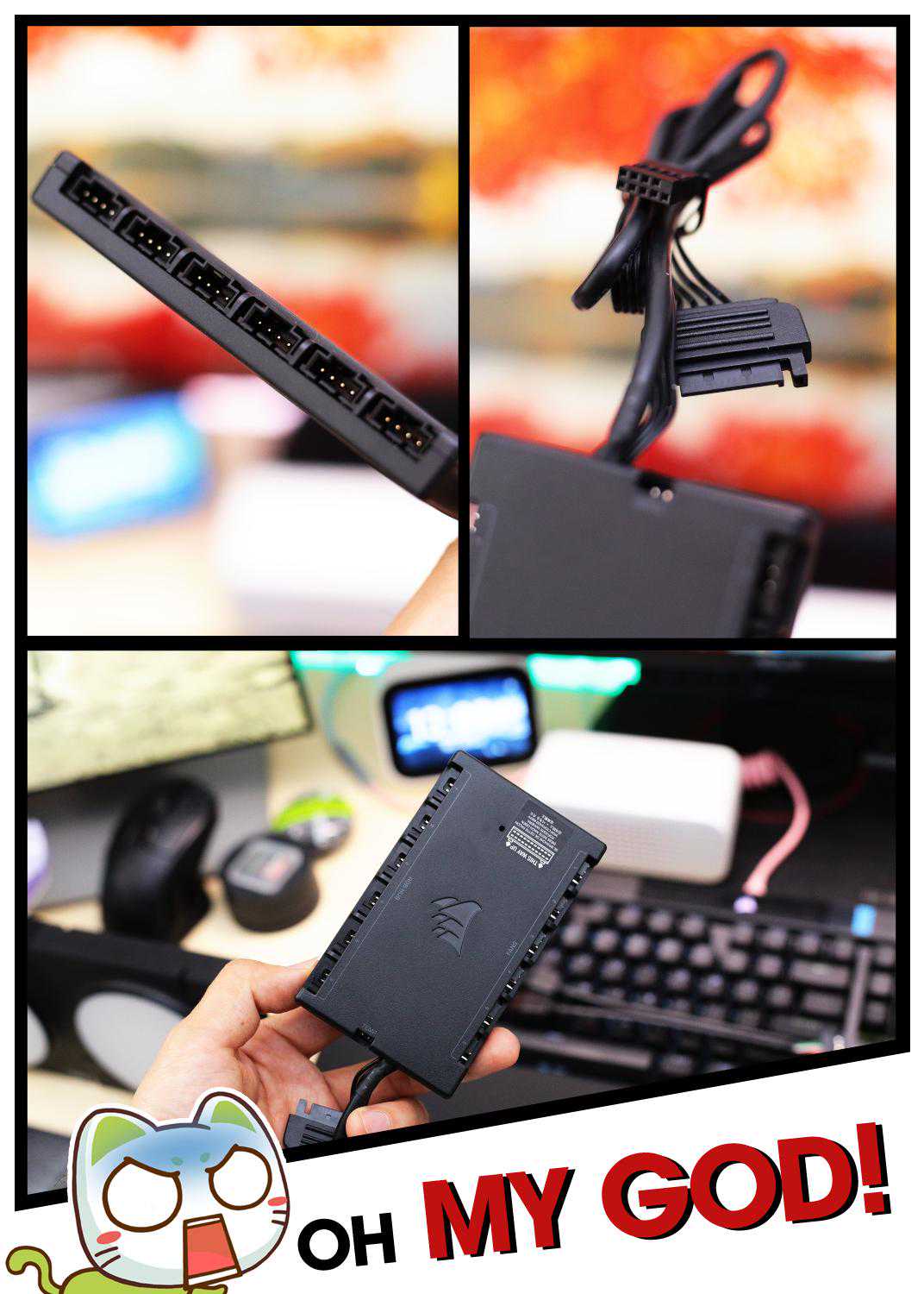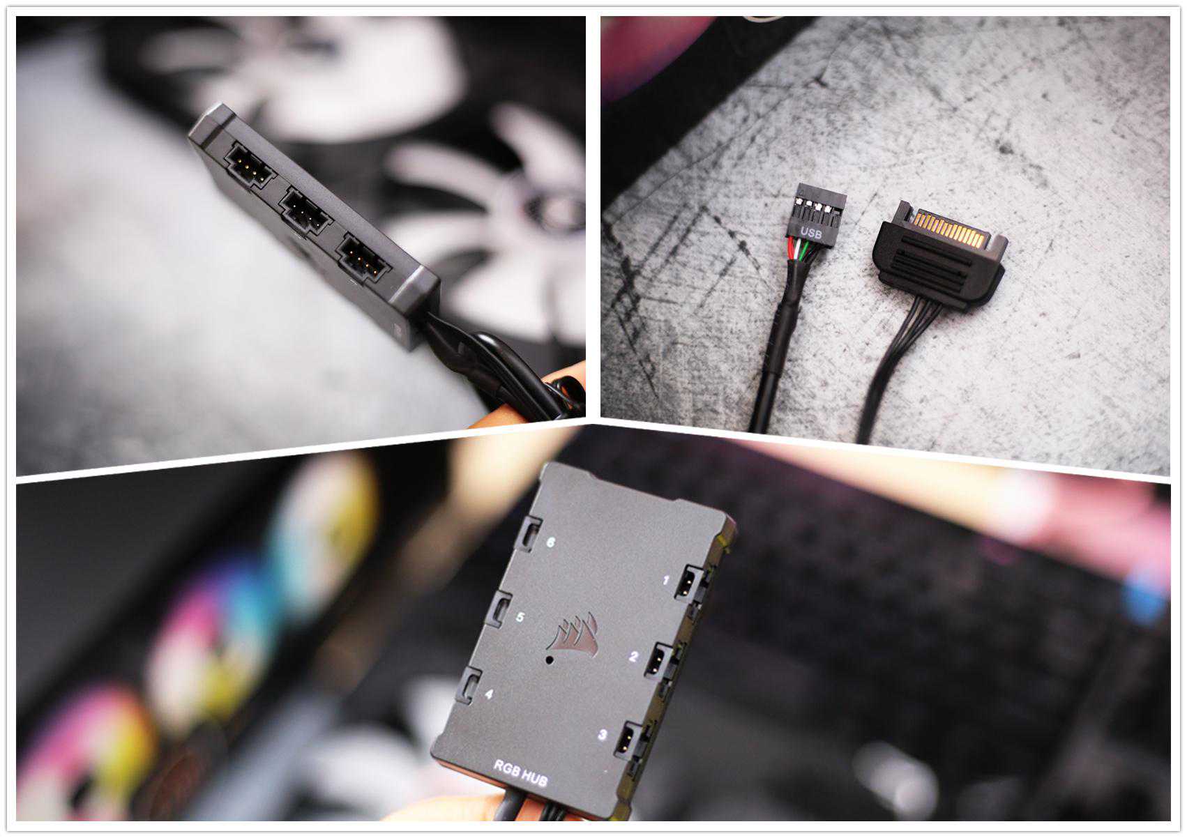 风扇所附赠的控制器最多可以插接3个风扇供电接头和3个风扇RGB接头,采用硬盘接口供电以及USB控制接口。