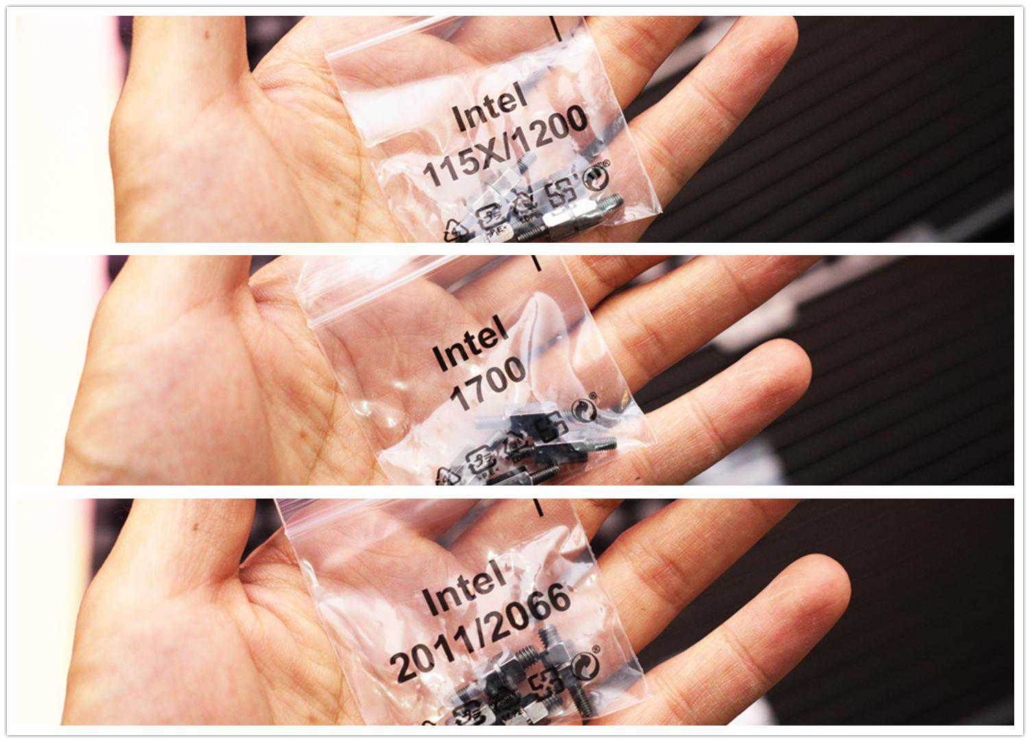 多种主板适配螺丝以及intel扣具、AMD/AM4扣具、TR4扣具,其中intel扣具内包含适配E31231V3这种1150古早扣具到最新的12代1700,覆盖面极广。