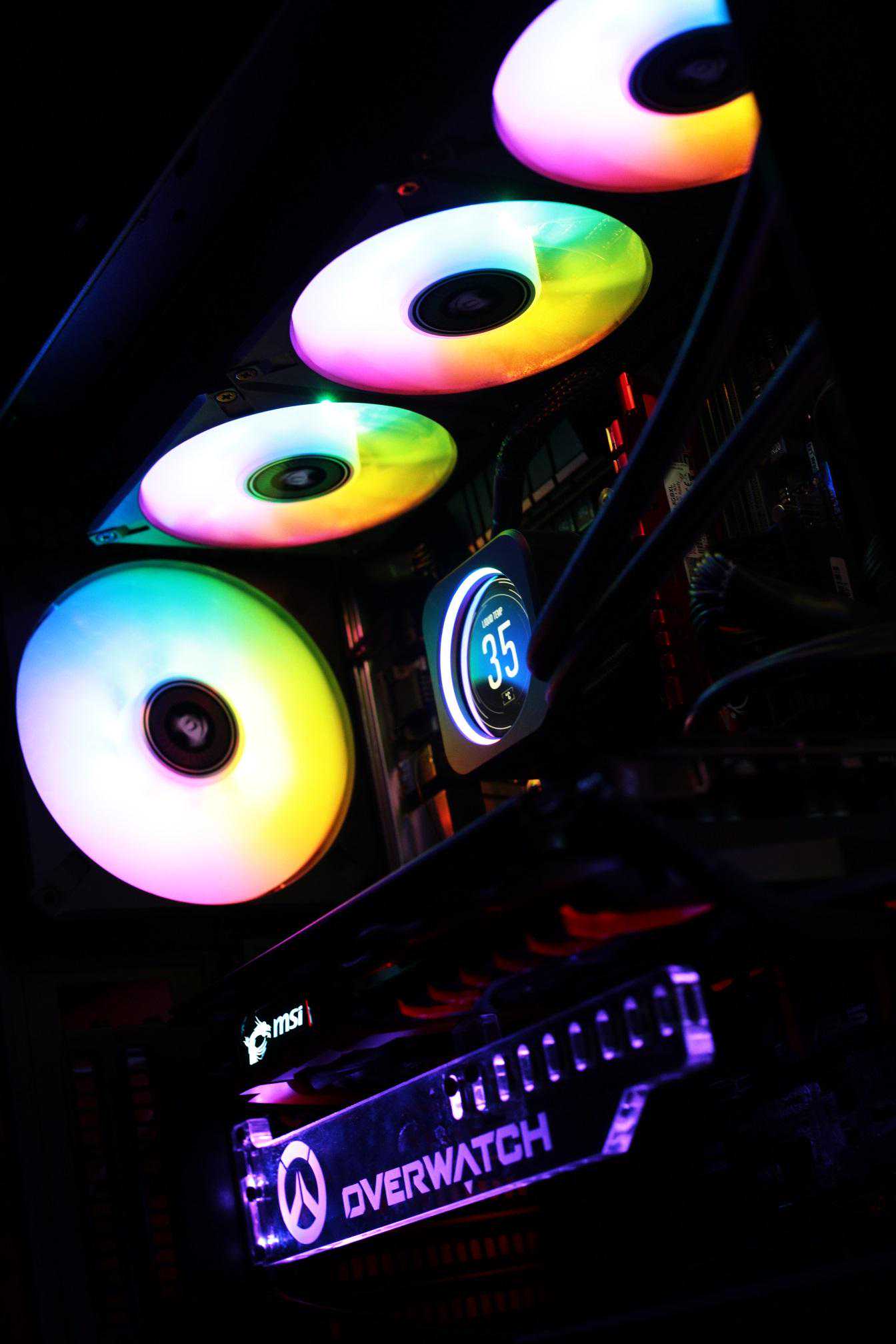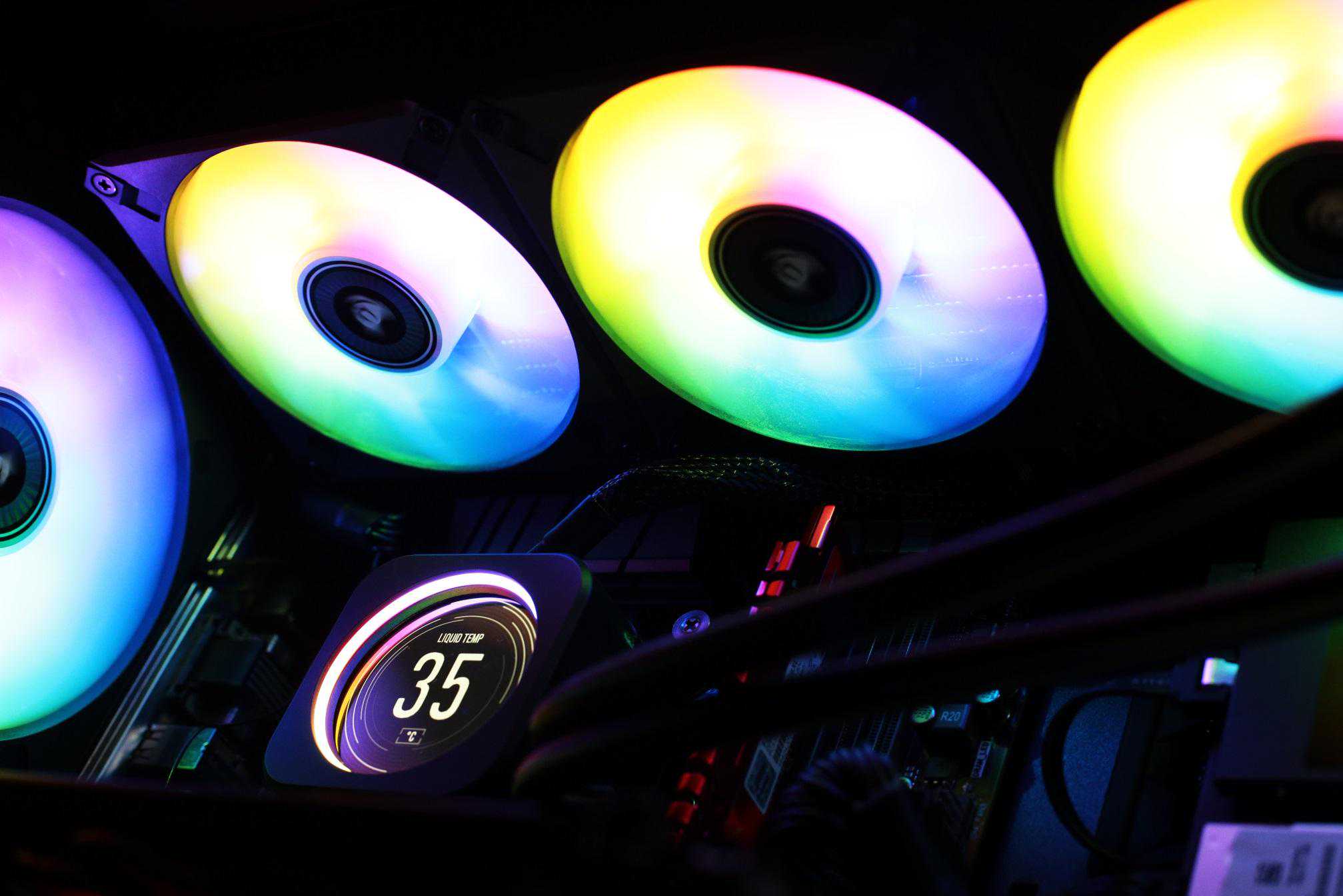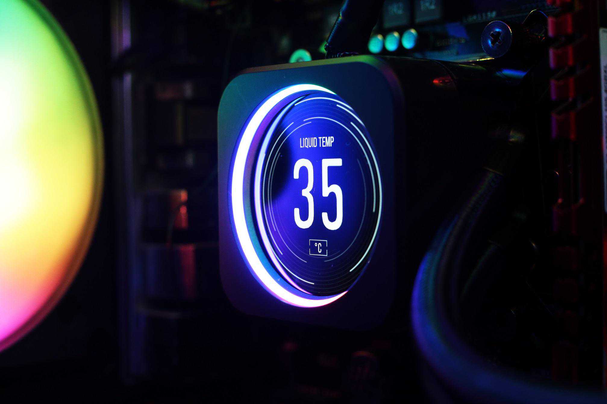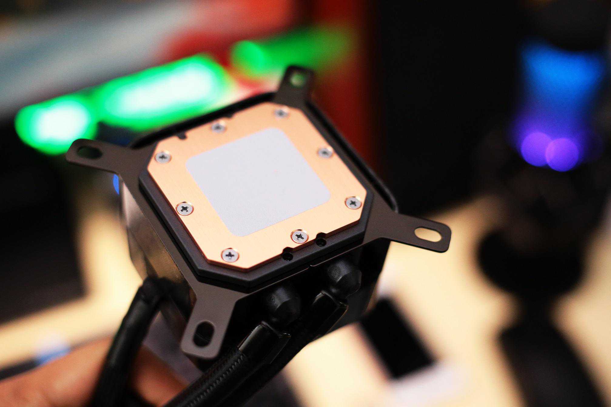 冷头上盖采用定制的2.1英寸有480×480分辨率IPSLCD屏幕,可以简单粗暴的理解为将一块屏幕装在水冷头上。除了中间的圆形LCD屏幕之外,周围还设有24颗可独立寻址的RGBLED灯珠,双重个性PUFF加持。