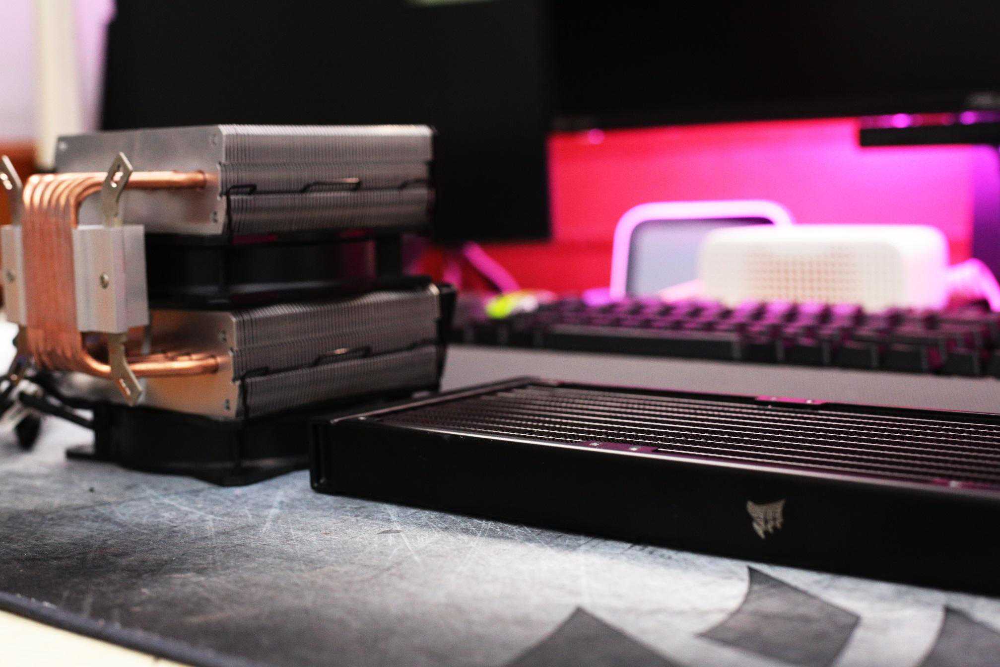 两款散热器的体型对比,可以看到水冷主要是利用机箱内横向空间,而且水冷排与水冷头分离结构下空间利用相比塔式风冷更加合理。
