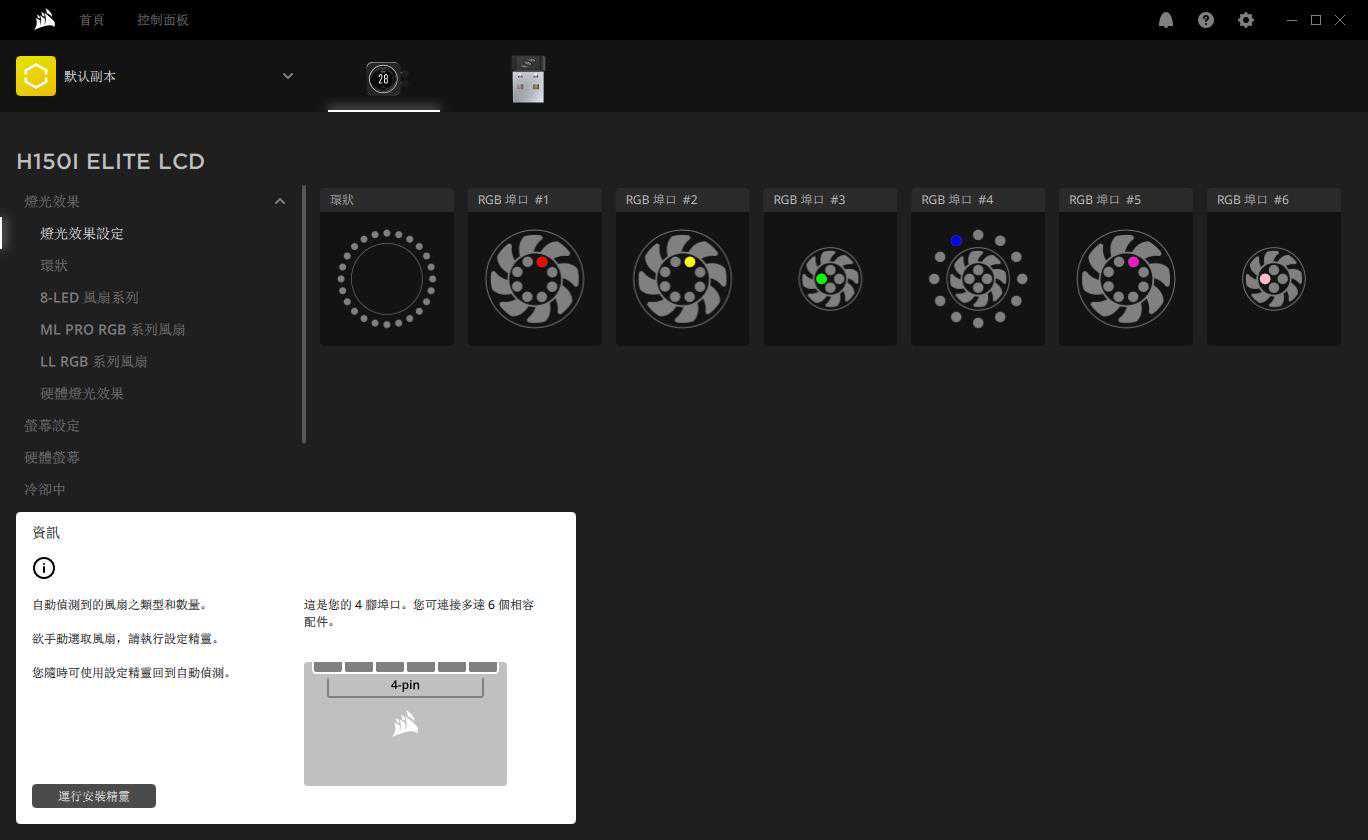 进入到H170iELITELCD控制界面就能看到包括LCD显示屏以及全部RGB风扇,在这里可以对自行对风扇进行编组,然后进行分组调节,也可以对所有风扇一键同步设置。