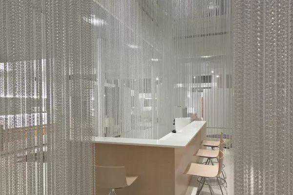 项目的核心是连接七层楼的中庭,自然光可以进入建筑内部,包括底层。金色的铝链挂在栏杆和假天花板的边缘,像一个巨大的面纱。