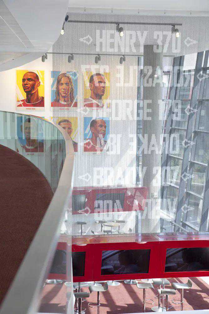 设计体现在他们最杰出的教练:查普曼(HerbertChapman)和温格(ArseneWenger),两个7.5x6米长的链式窗帘上映出了他们的肖像悬挂在一个多用途的活动和恢复空间。