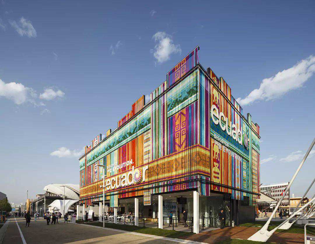 设计的目的是使展馆在周围的建筑中脱颖而出,这得益于它的立面,创造了与该国传统和独特元素的情感联系。立面的图案来自奥塔瓦洛地区的面料,在设计上进行了调整和更新以实现这一点。