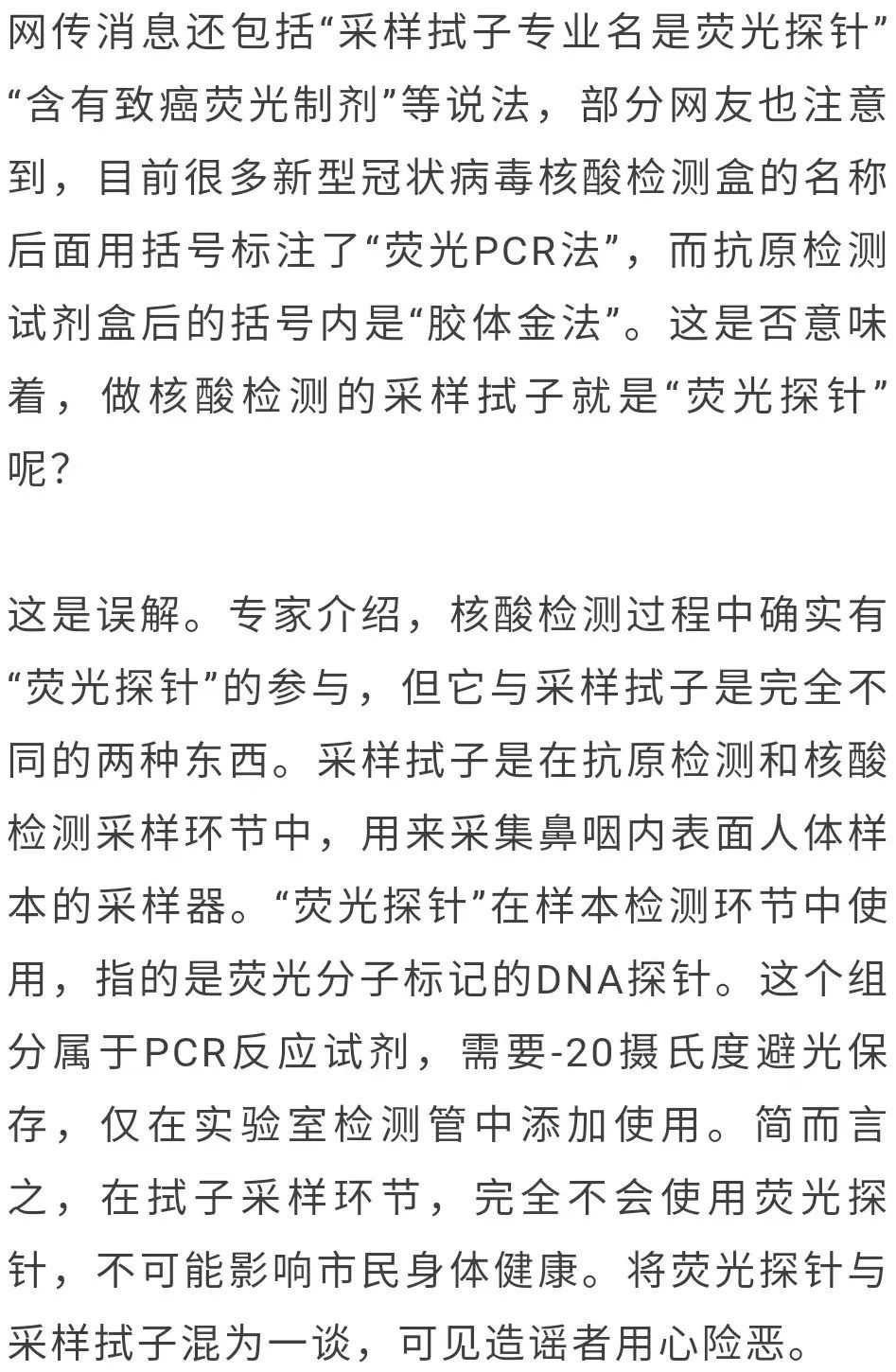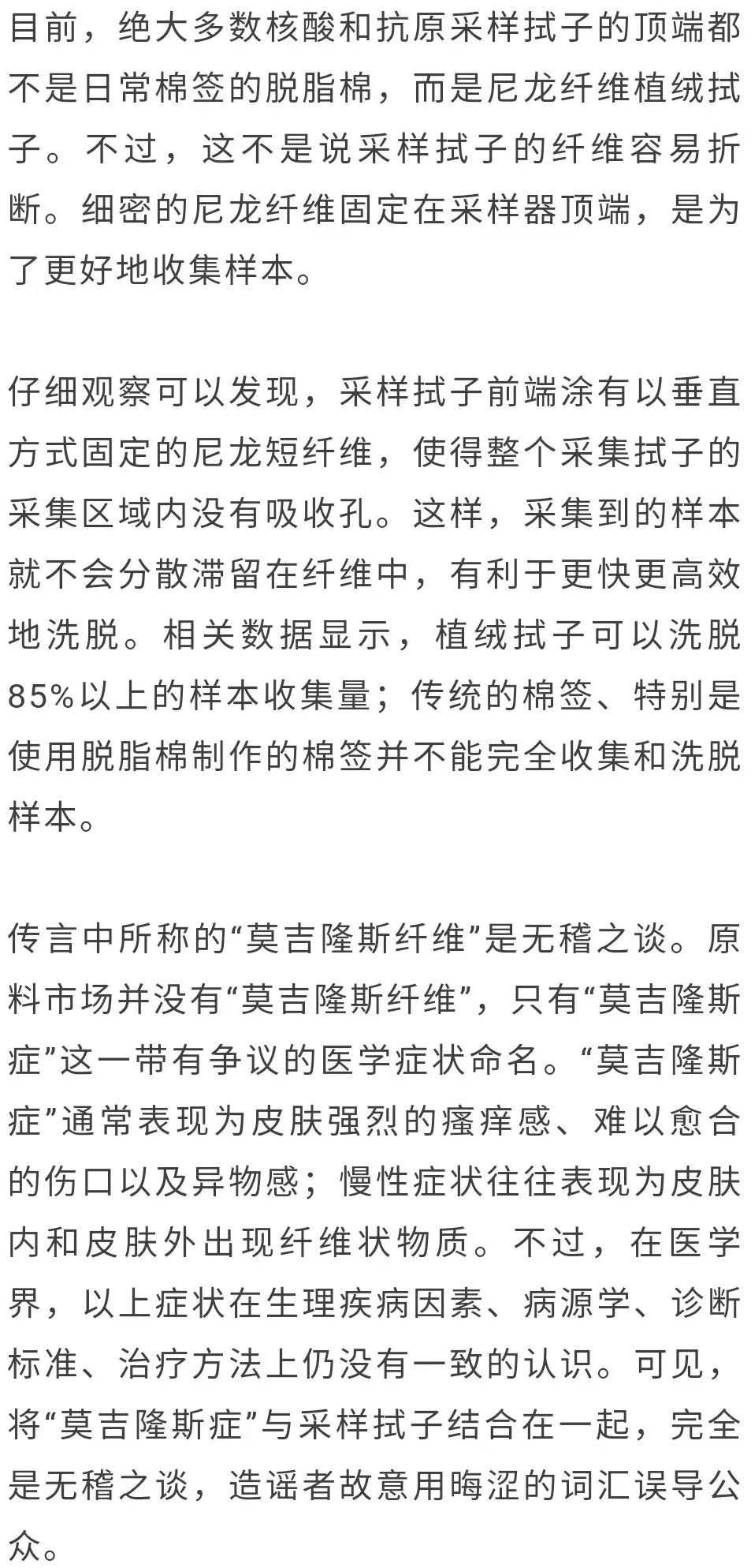 从核查情况看,最新传言中所说的“采样拭子不叫棉签,是化纤”的说法没有错,但其他说法都是错的。