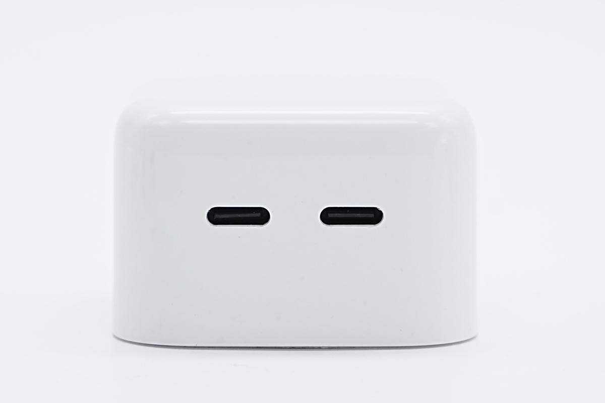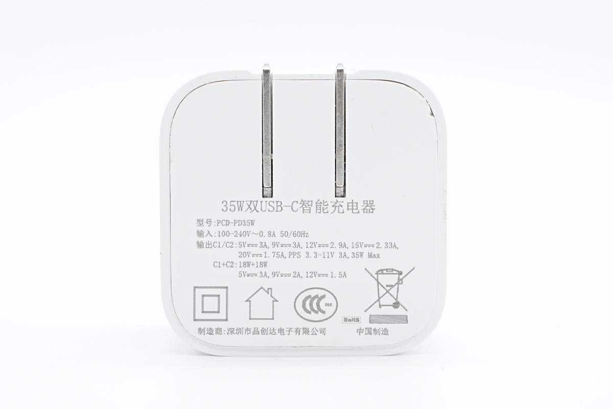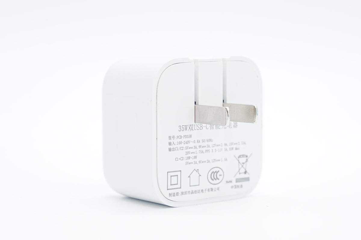 充电头网拿到了品创达推出的35W双USB-C充电器,这款充电器采用了与苹果充电器接近的外观造型,同样配备折叠插脚,便于携带与收纳。充电器支持双口功率盲插,两个接口均支持35W输出,双口同时输出时支持功率自动分配,且双口均支持快充,满足两个设备同时快充需求。下面充电头网就对这款充电器进行拆解,看看内部的用料和设计如何。