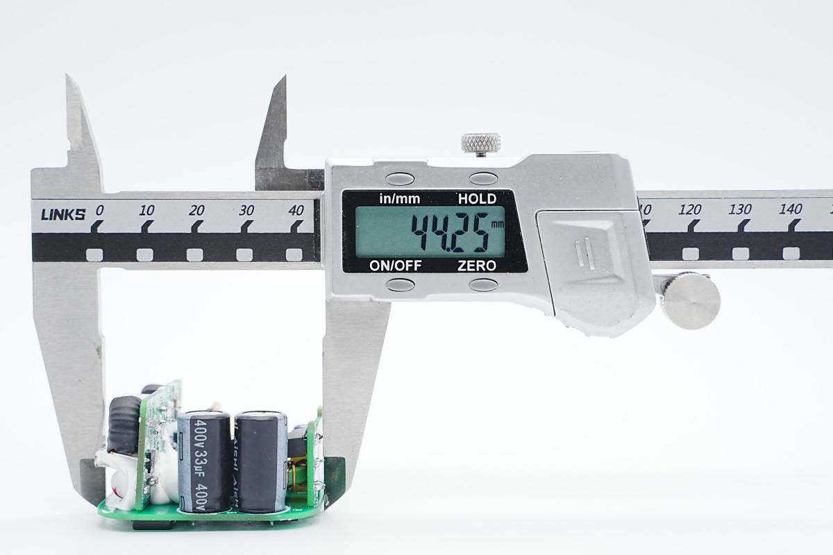 使用游标卡尺测得PCBA模块长度约为44.25mm。