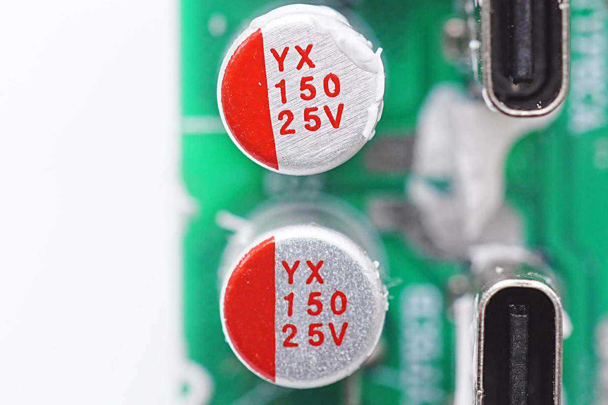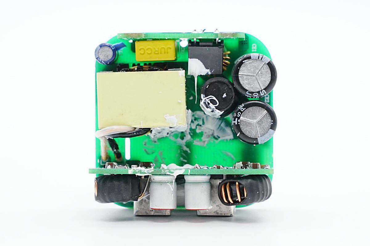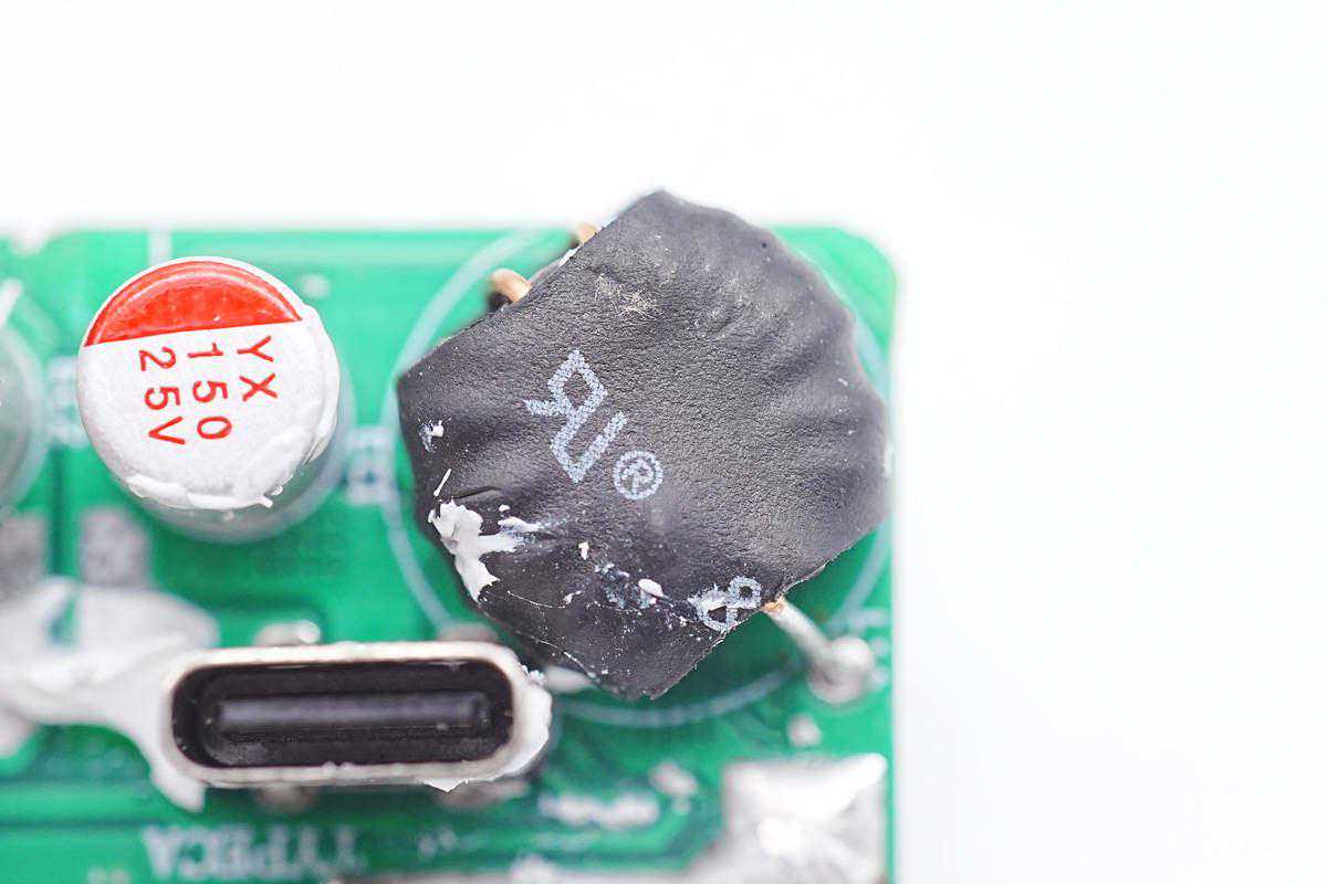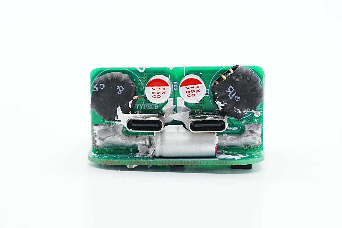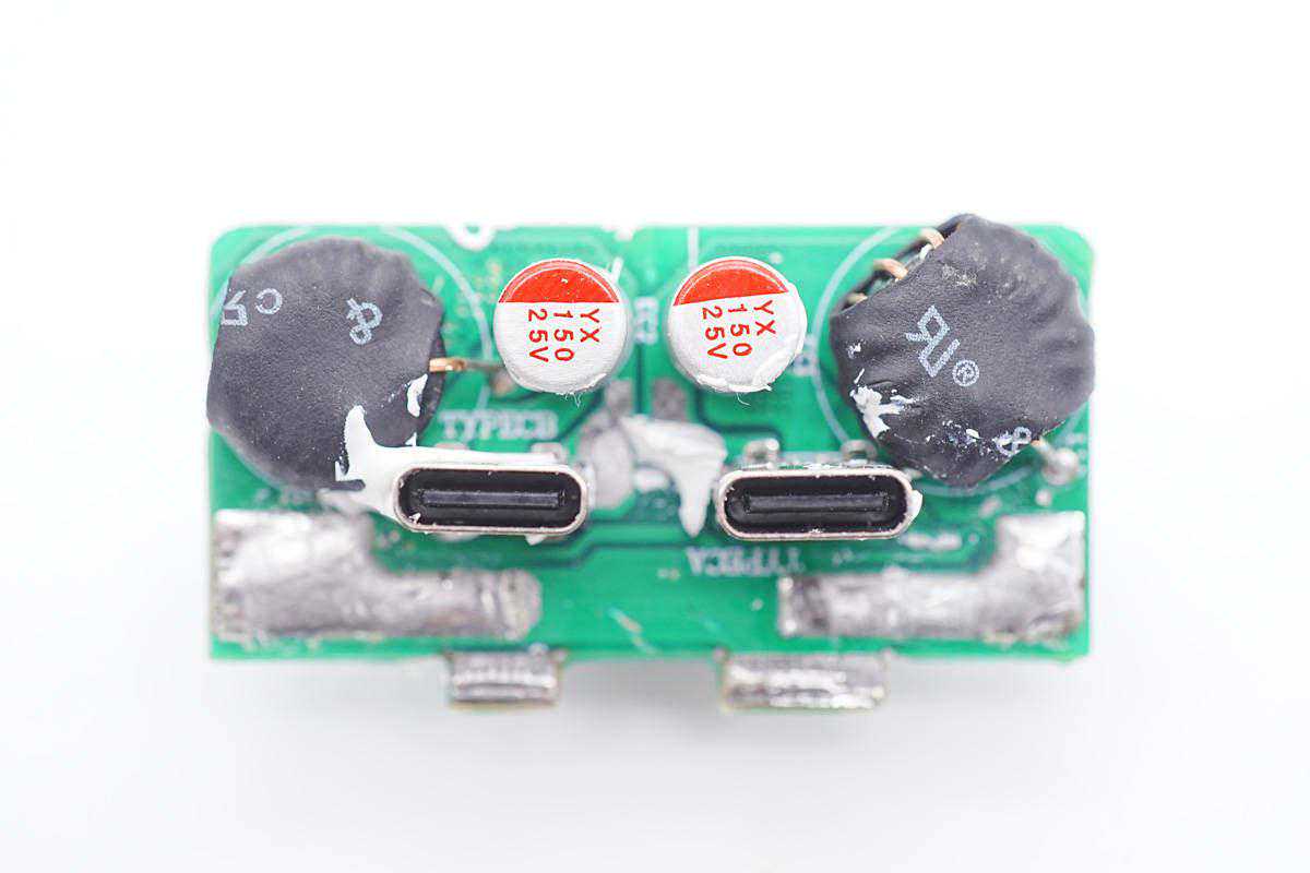 充电器输出侧焊接二次降压小板,USB-C母座下方是一颗固态电容,用于输出滤波。