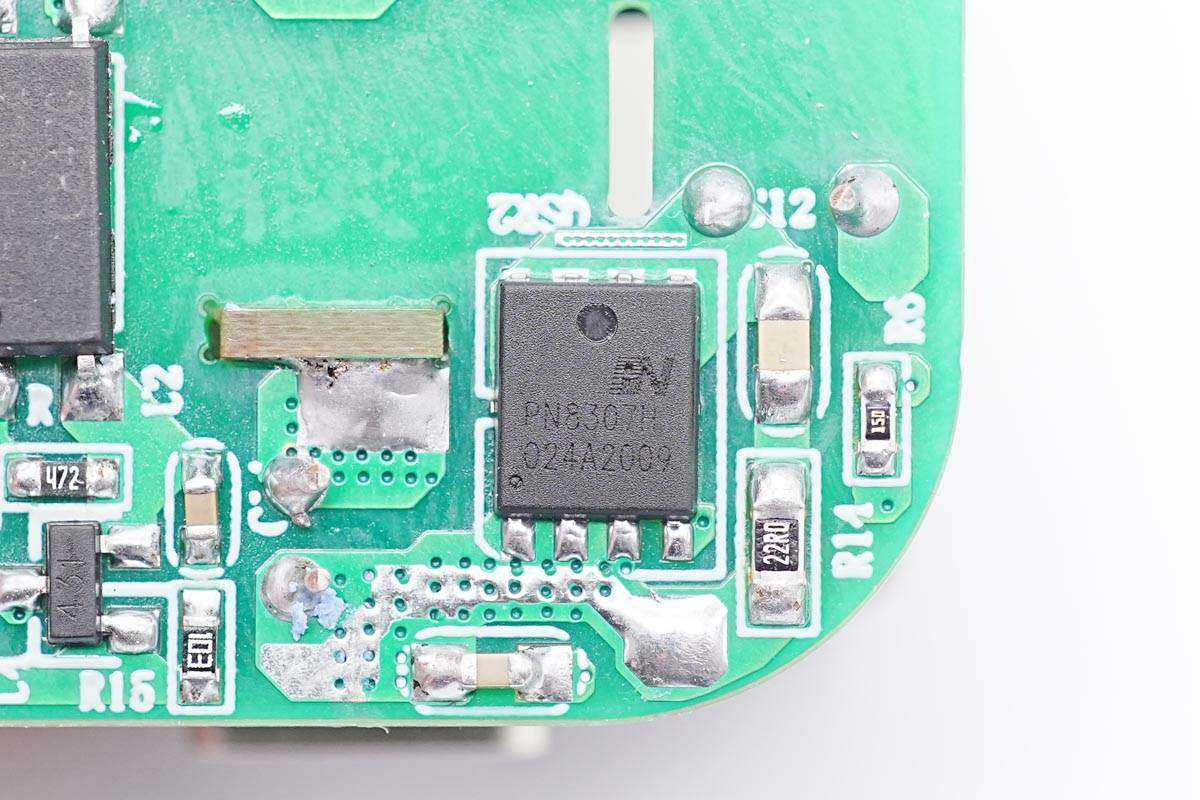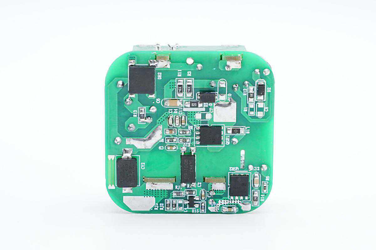 PCBA模块背面焊接整流桥,初级电源芯片,贴片Y电容,光耦和一颗同步整流芯片,得益于使用了高集成的电源芯片和同步整流芯片,整个充电器的电路非常简洁。