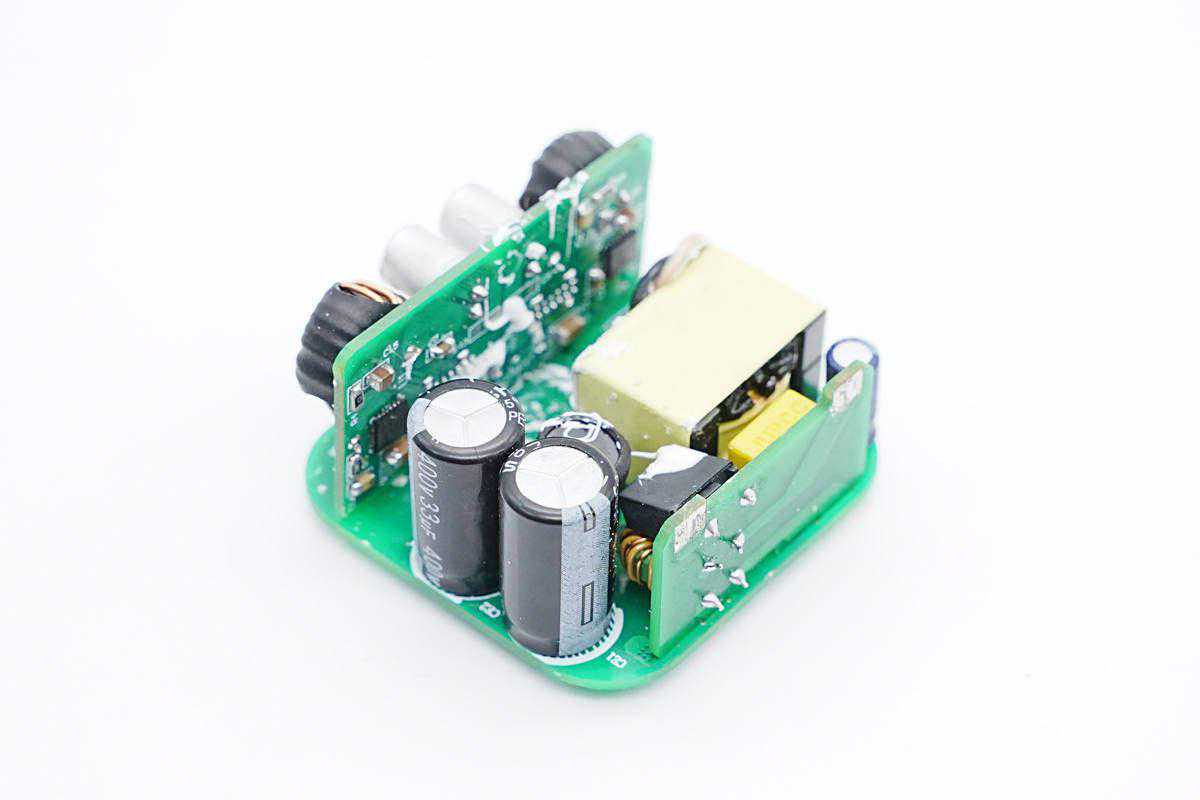 充电器内部PCBA模块采用三块PCB焊接组成,输入端一块小板焊接保险丝和输入EMI器件。