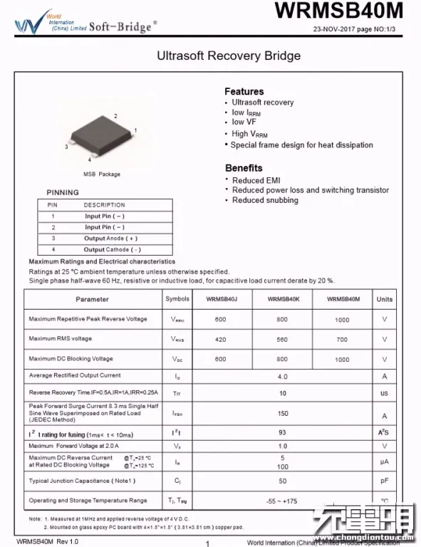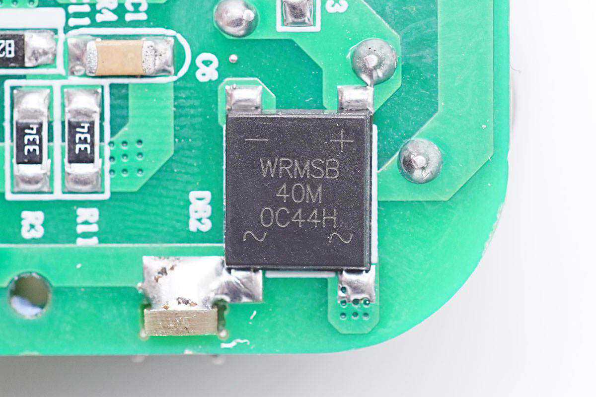 输入端整流桥来自沃尔德,型号WRMSB40M,这颗软桥通过较软的恢复曲线,比较平滑的关断特性,可以降低二极管结电容达到非常少的谐波振荡产生的效果。
