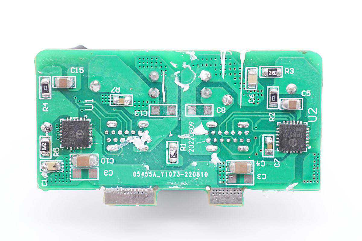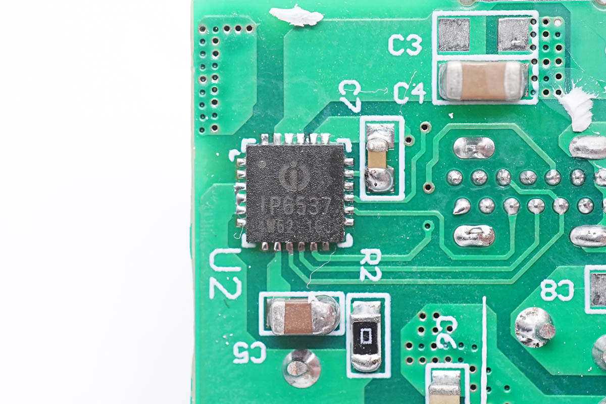 充电头网通过拆解了解到,这款充电器采用三块PCB组合焊接,内部采用芯朋微高集成快充电源方案,固定电压输出。输出使用两路英集芯IP6537降压转换器降压,用于两个USB-C口独立快充输出。内部元器件打胶固定,PCB背面粘贴导热垫利用外壳散热,内部的设计和做工都很可靠。