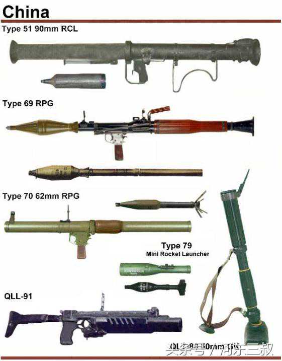 十、步兵小炮步兵手中的大杀器,包括:51式90毫米火箭筒(仿美国M20式88.9毫米火箭筒),69式40毫米火箭筒(仿RPG-7型火箭筒),QLT89式50mm榴弹弹射器(89式弹射器)。