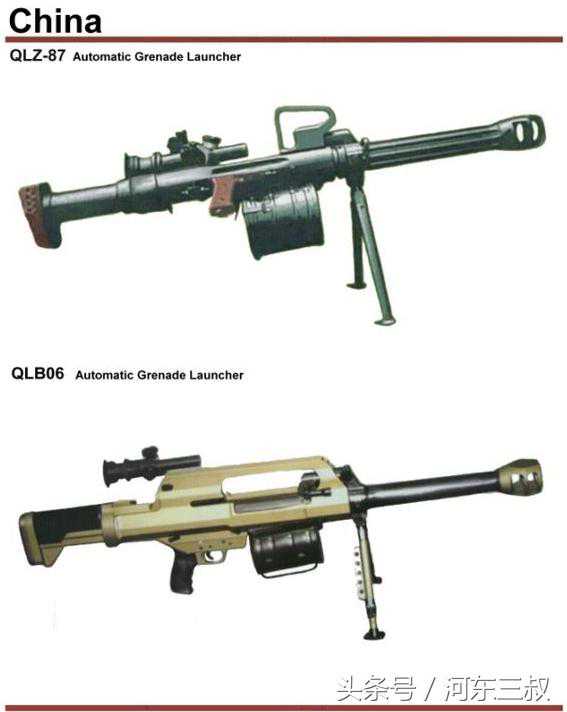 QLZ87自动榴弹发射器(配套6发和15发两种弹鼓),QLB-06榴弹发射器,单兵大杀器。
