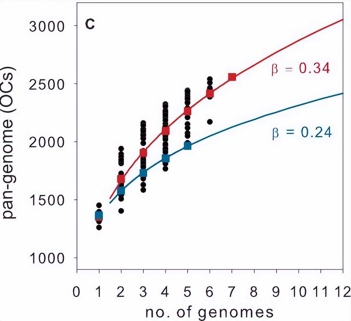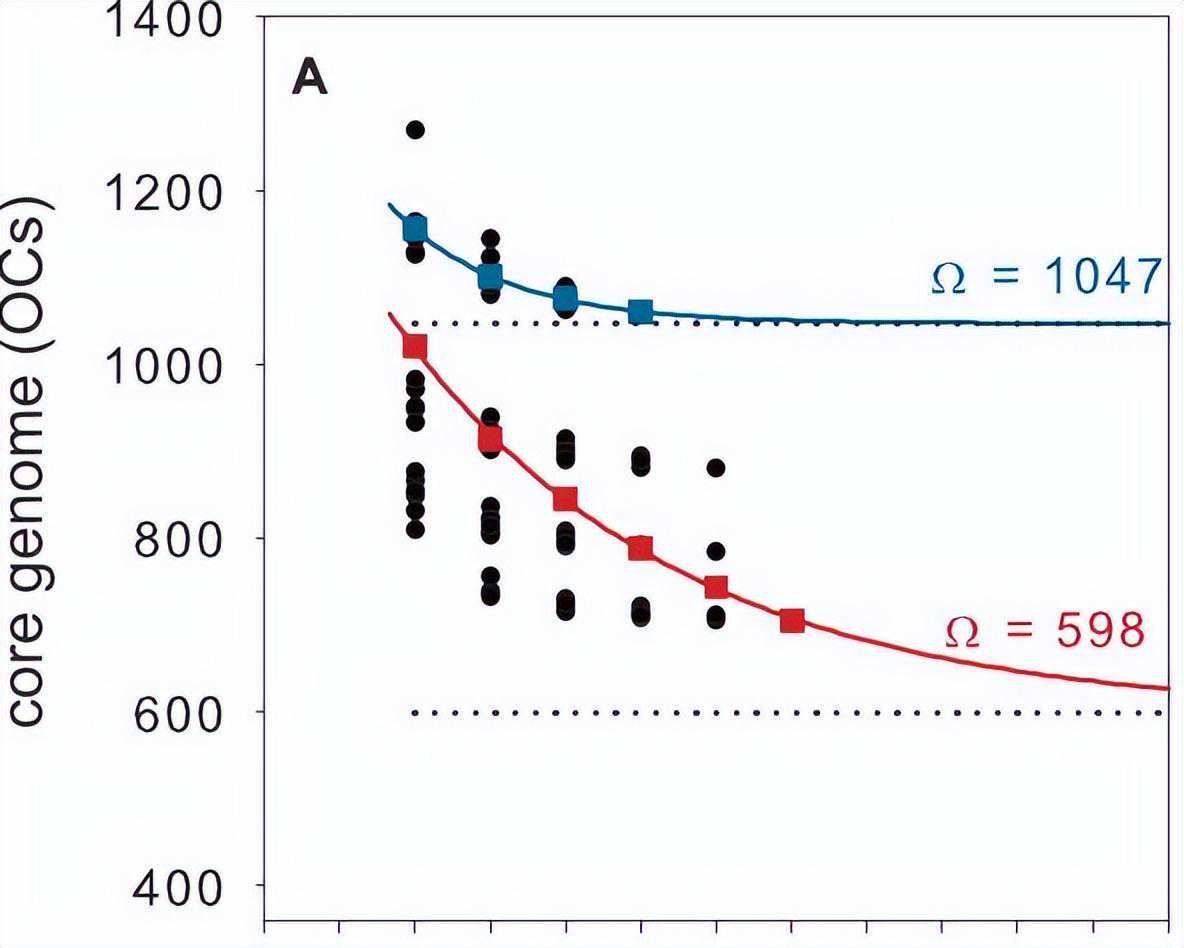 核心基因组和柔性基因组中基因的实际数量因系而异,核心SAR11和亚支Ia基因组的预测大小是通过将指数衰减函数拟合到为七个基因组序列的顺序相加计算的核心OC的平均数量。