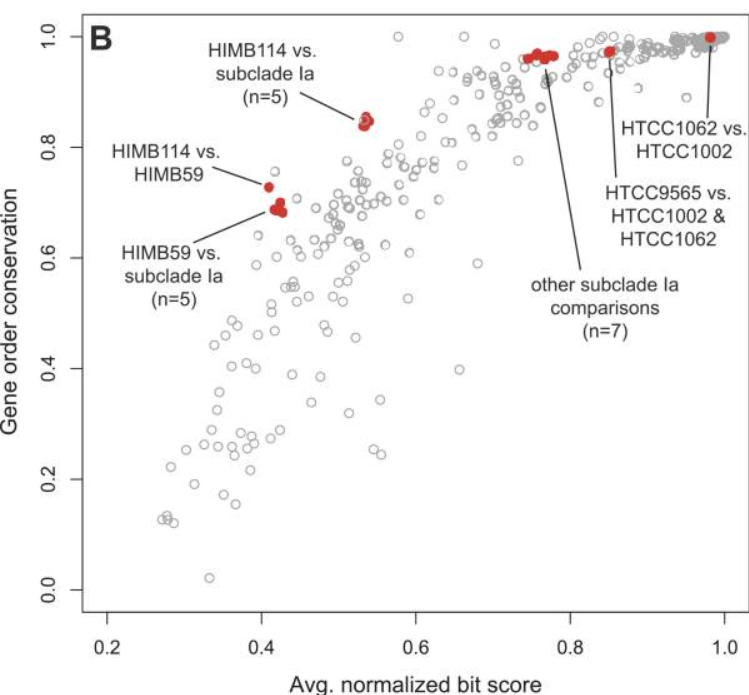 基于与亚支Ia的其他基因组的共性,HTCC9565基因组的缺失信息量估计为1至约5.5kbp,虽然HIMB114基因组的完成程度更难估计,但最近测序的第二个亚支IIIa基因组的完成度为1.285Mbp,比目前的HIMB50序列大不到114kbp。