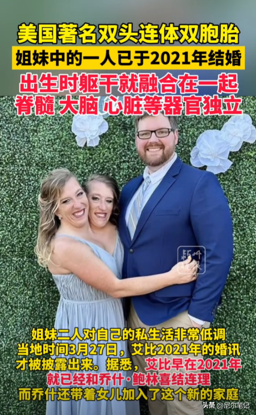 据媒体爆料,在这对连体人姐妹中,艾比与丈夫乔什·鲍林已经结婚两年多了。