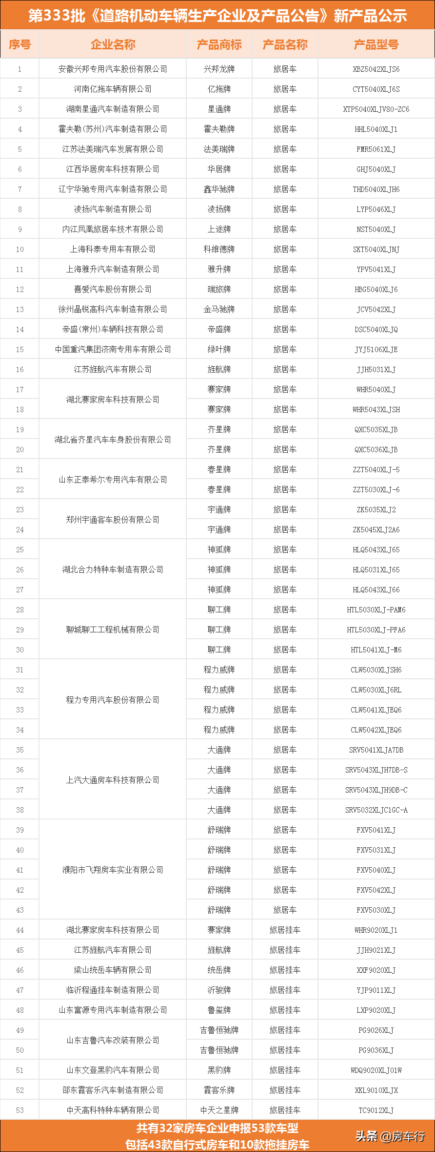共有32家房车企业申报53款车型,包括43款自行式房车和10款拖挂房车,小编将具体的名单整理列出了表格,想要了解更多的小伙伴们可以去国家工信部网站了解更多详情哦!